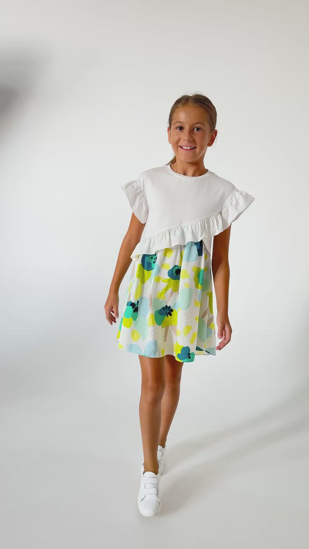 Üst kısmı beyaz kısa kollu örme kumaştan, alt tarafı ise çiçek desenli dokuma kumaştan tasarlanmış bu elbise, göğüs kısmındaki fırfır detayıyla şıklığını tamamlıyor. Rahat ve günlük kullanıma uygun bu elbise, hem yazın serinliğini hem de eğlenceli desenleriyle neşe katıyor. Hem basit hem de etkileyici bir tasarım arayanlar için harika bir elbise