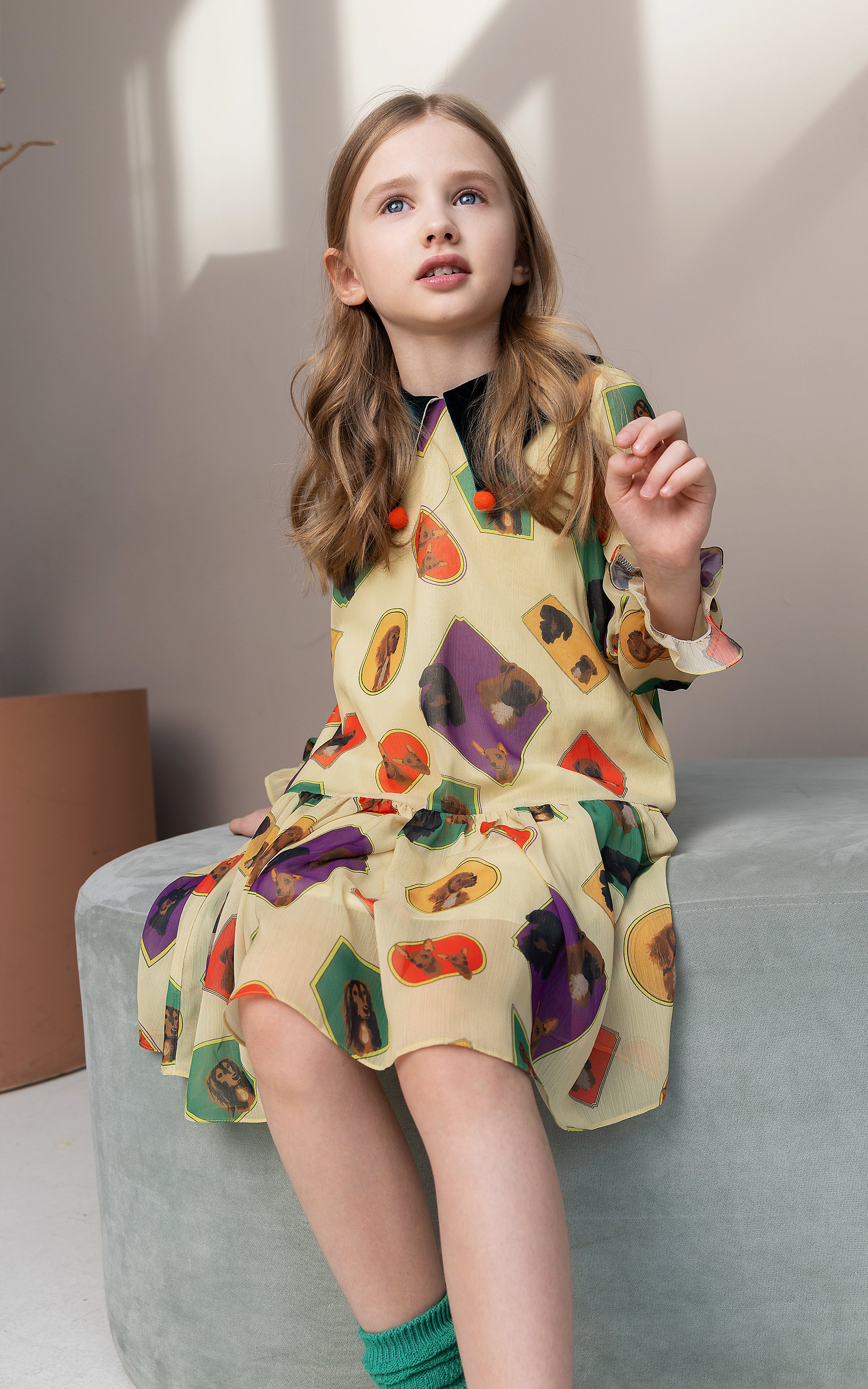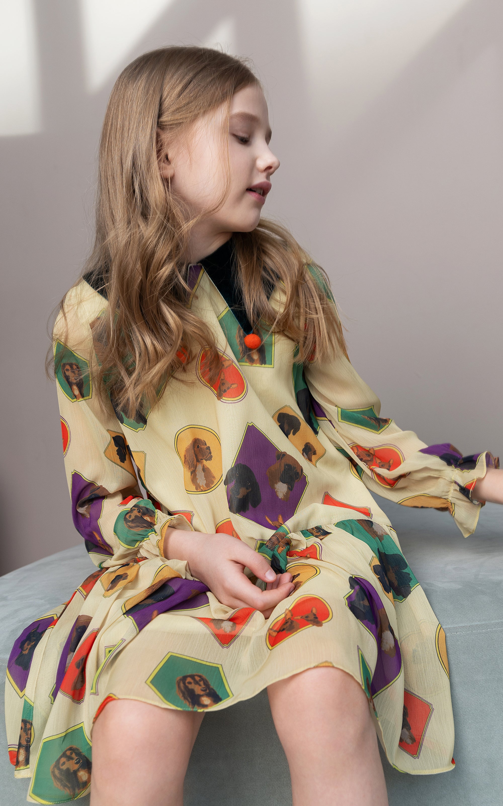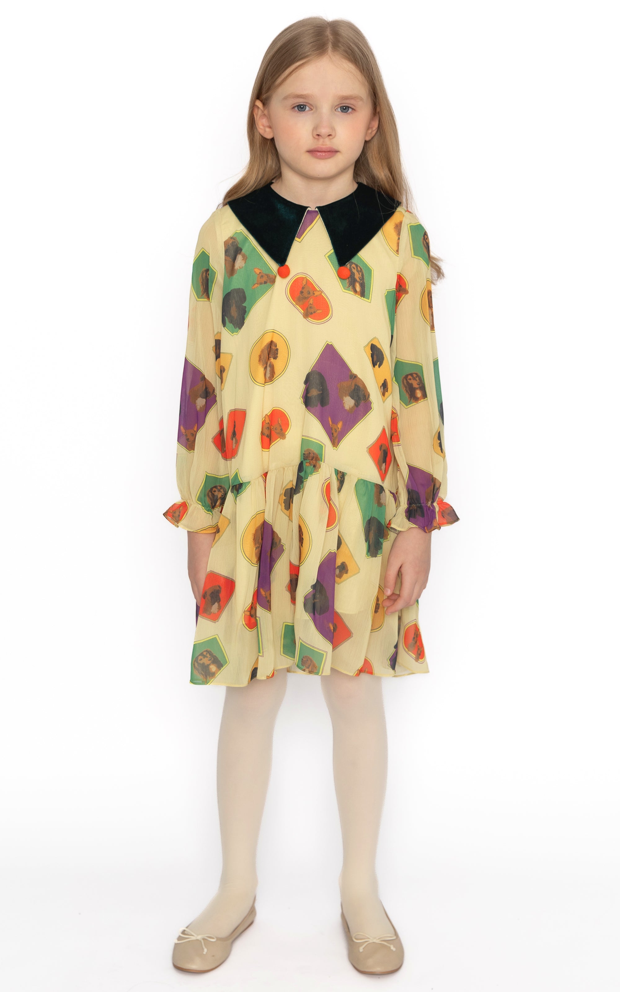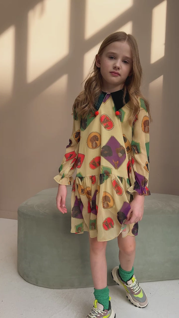 Köpek desenleri ile tasarlanmış şifon elbise, yeşil kadife yakası vardır. %100 Pamuk kumaşla astarlanmıştır.