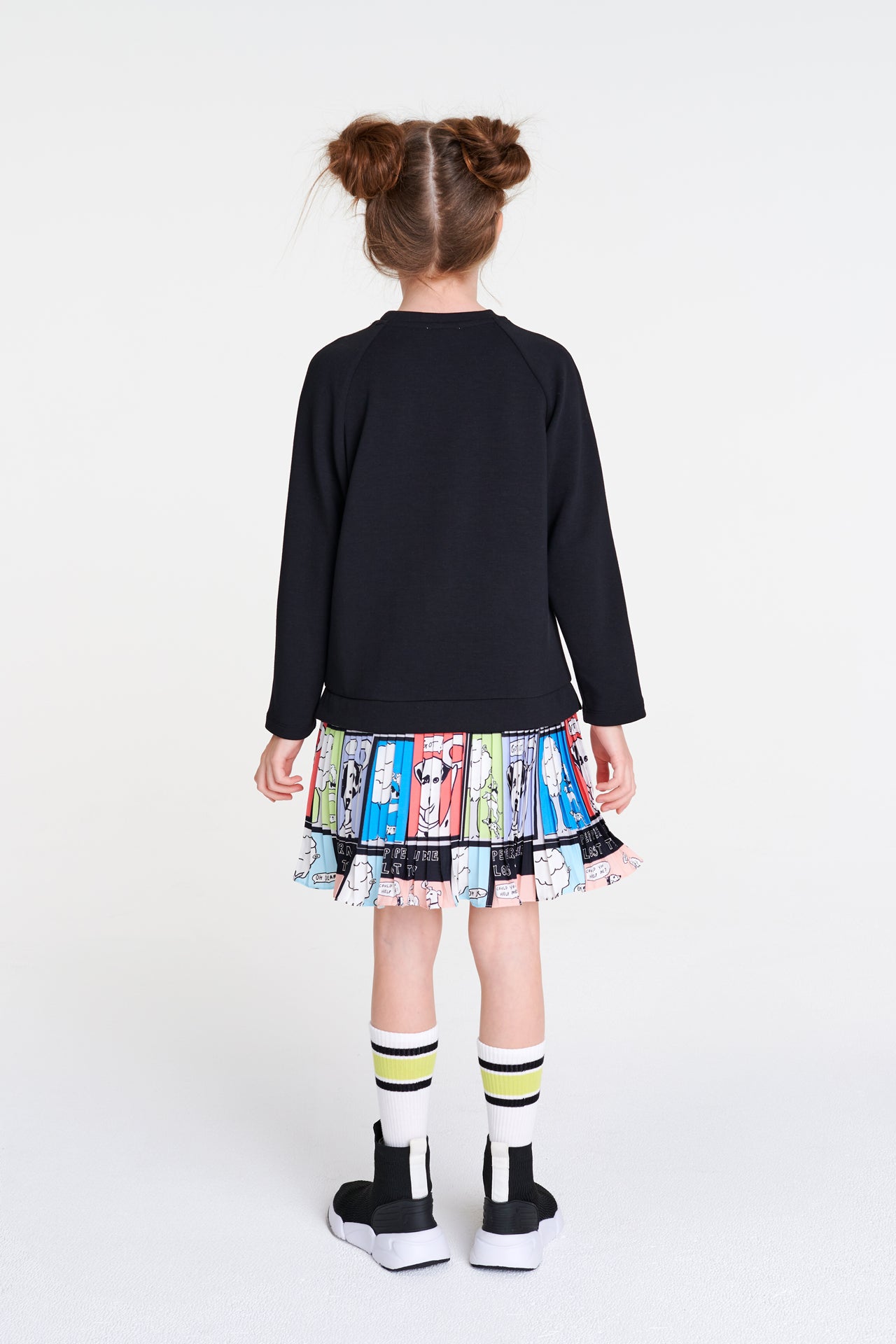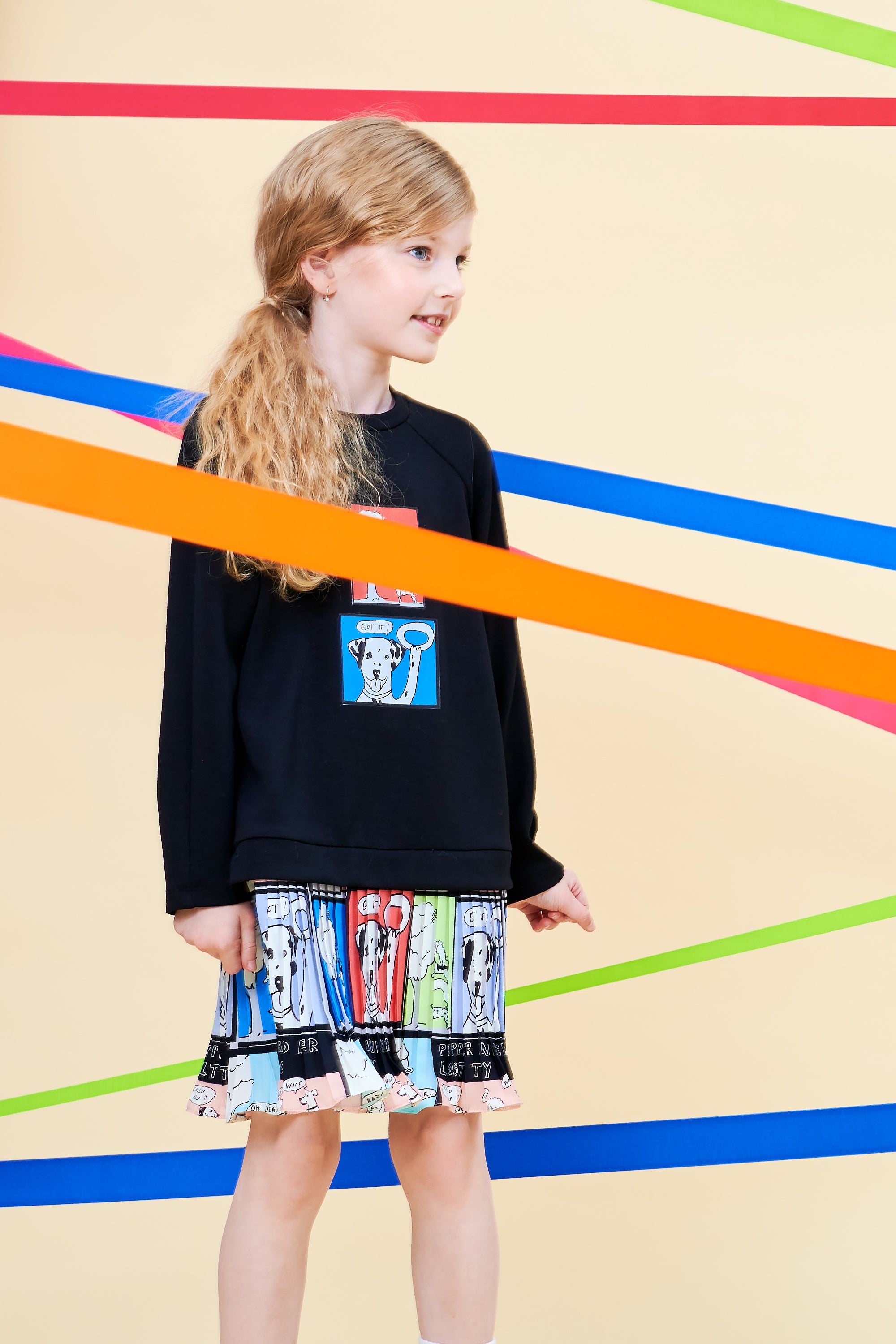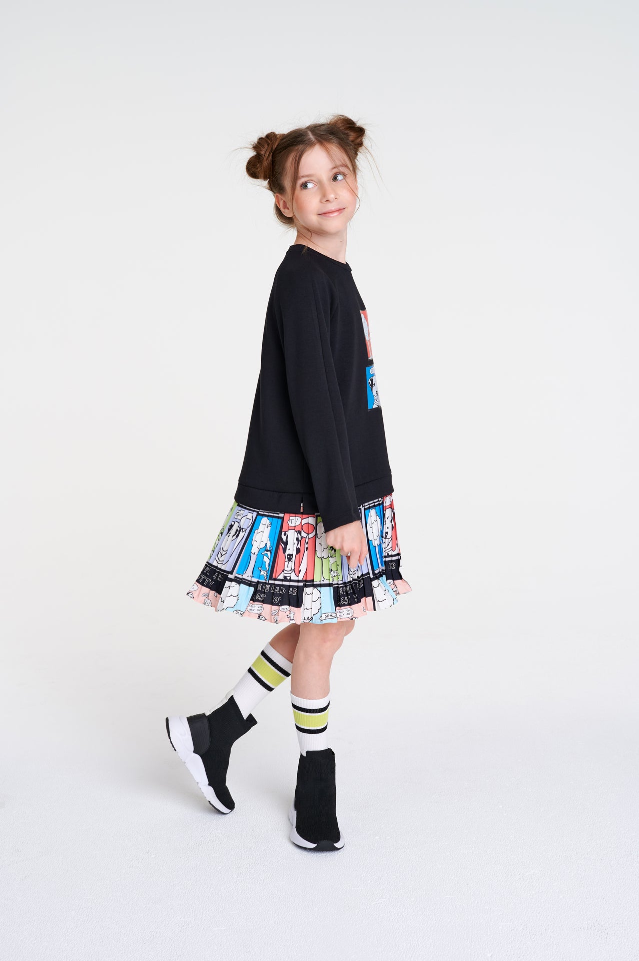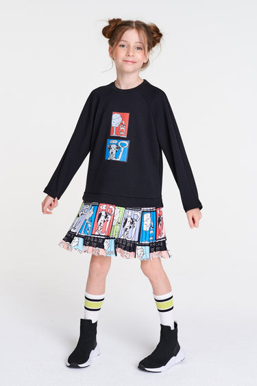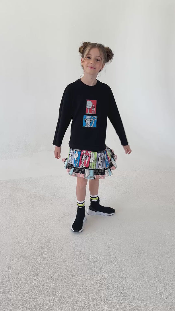 Siyah örme kumaştan sweatshırt kız çocuk elbisenin etek üçları dalmaçyalı köpek desenli pileli kumaştandır.