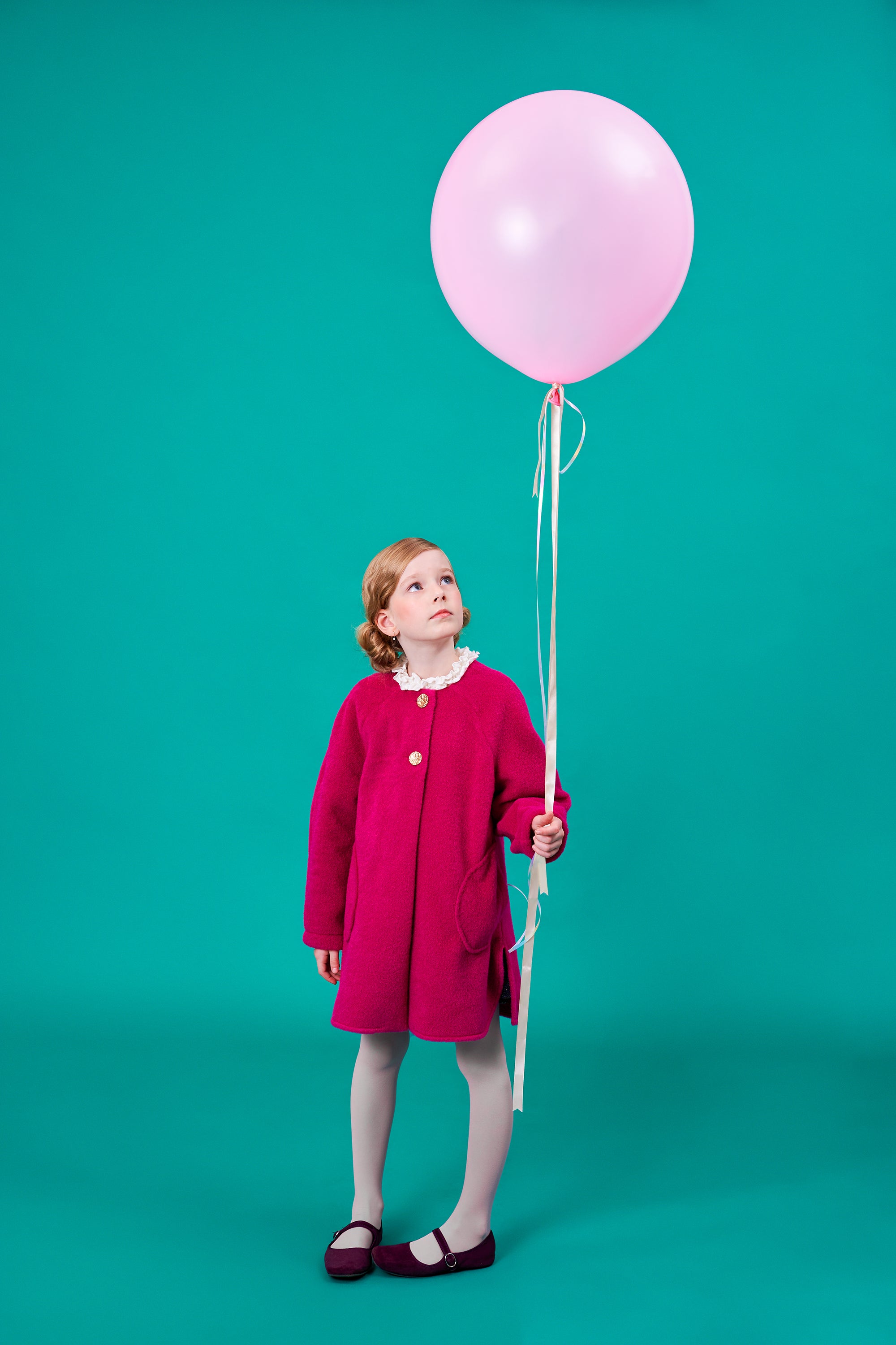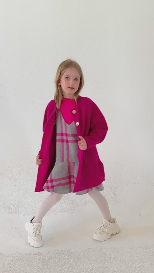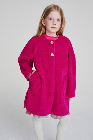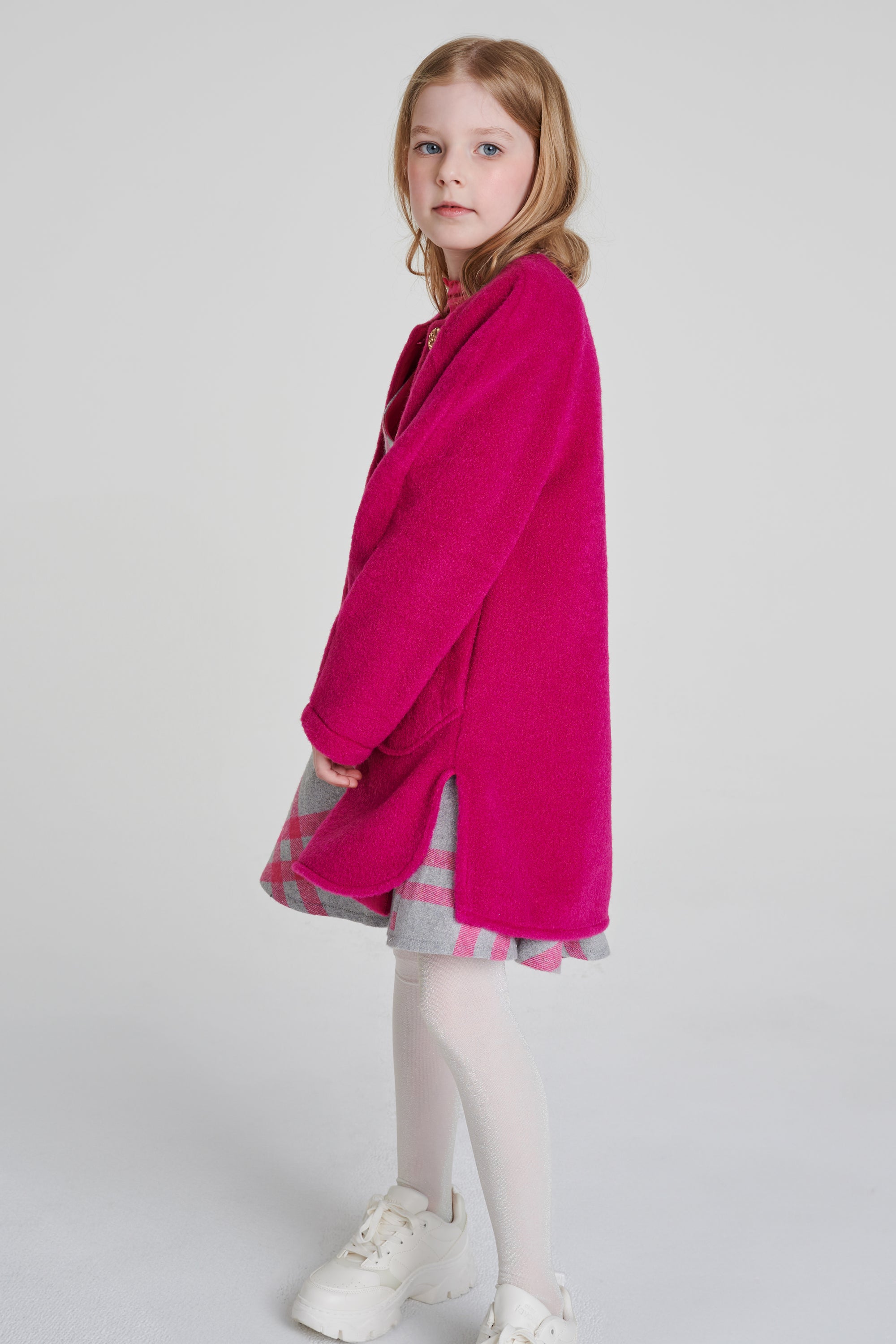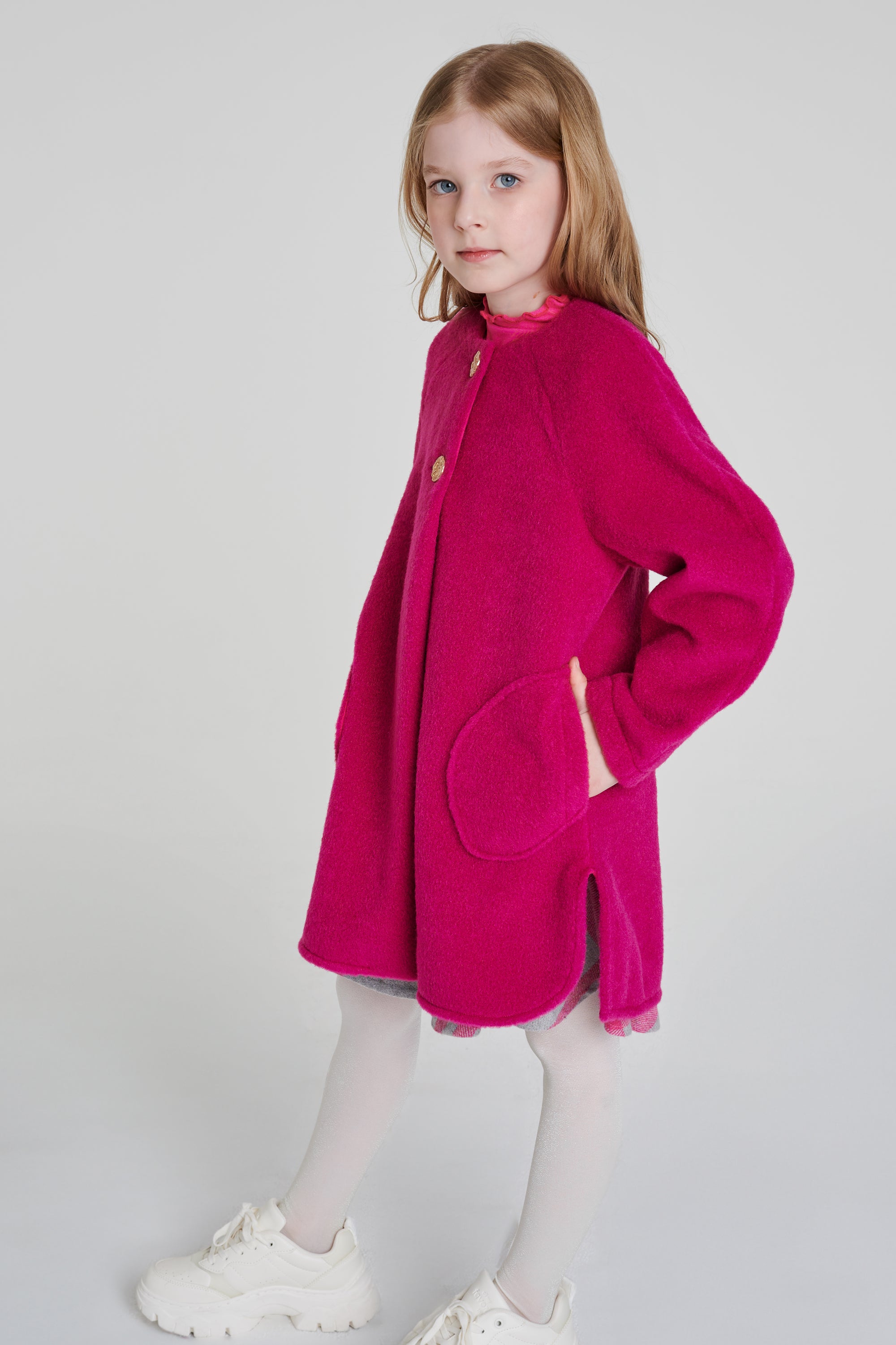 Fuşya rengi kız çocuk kaşe kaban. Saten astarlı, önden düğmeli ve ceplidir.