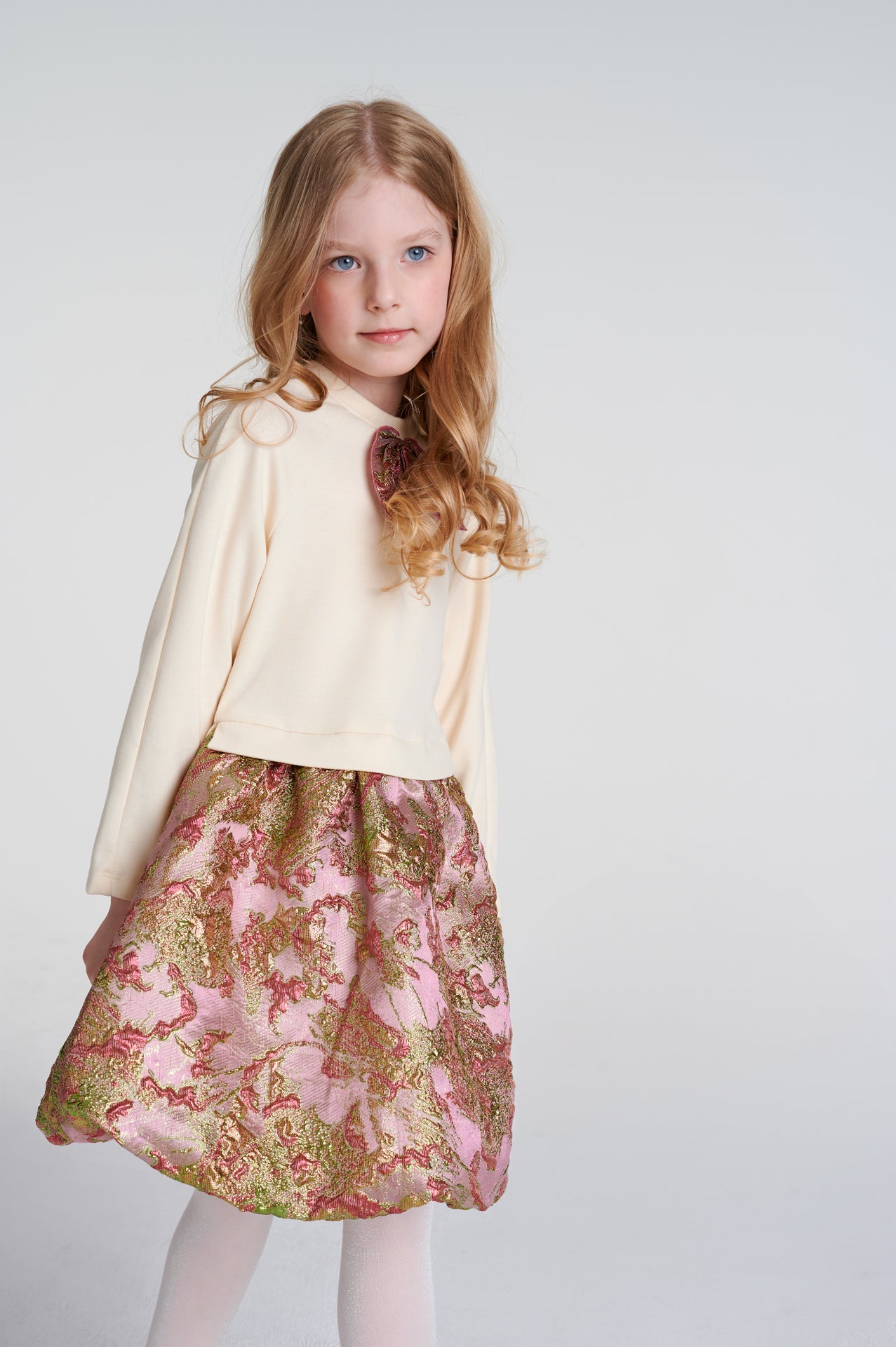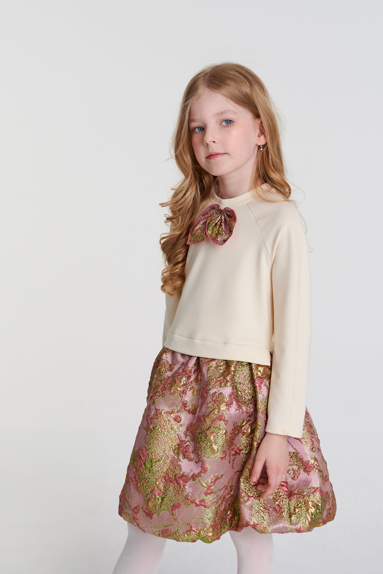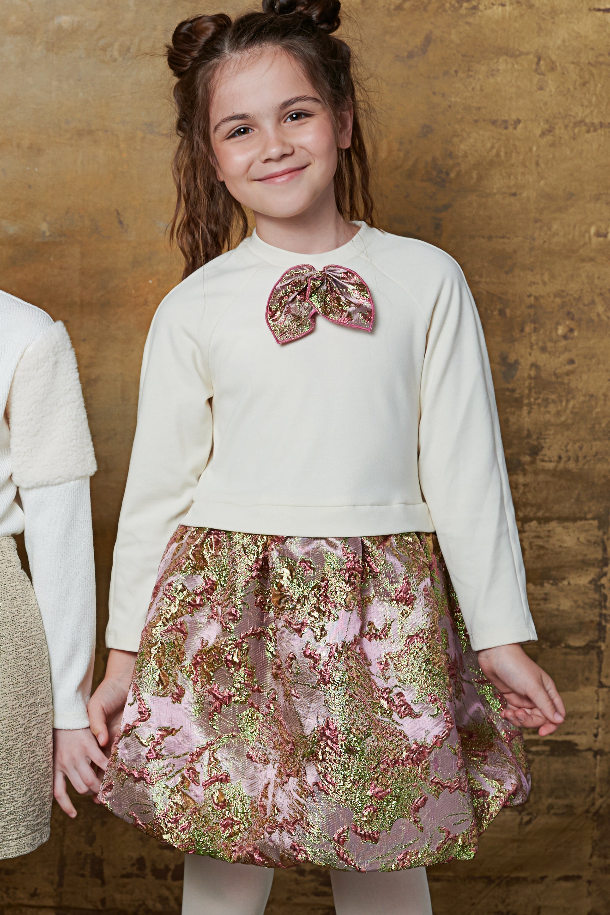 Jakar kız çocuk ebisenin üst bedeni esnek örme kuşatır. alt kısmı ise altın rengi jakar kumaştan imal edilmiştir. Yine etek kısmındaki jakar kumaştan göğüs kısmında fiyonk detayı vardır.