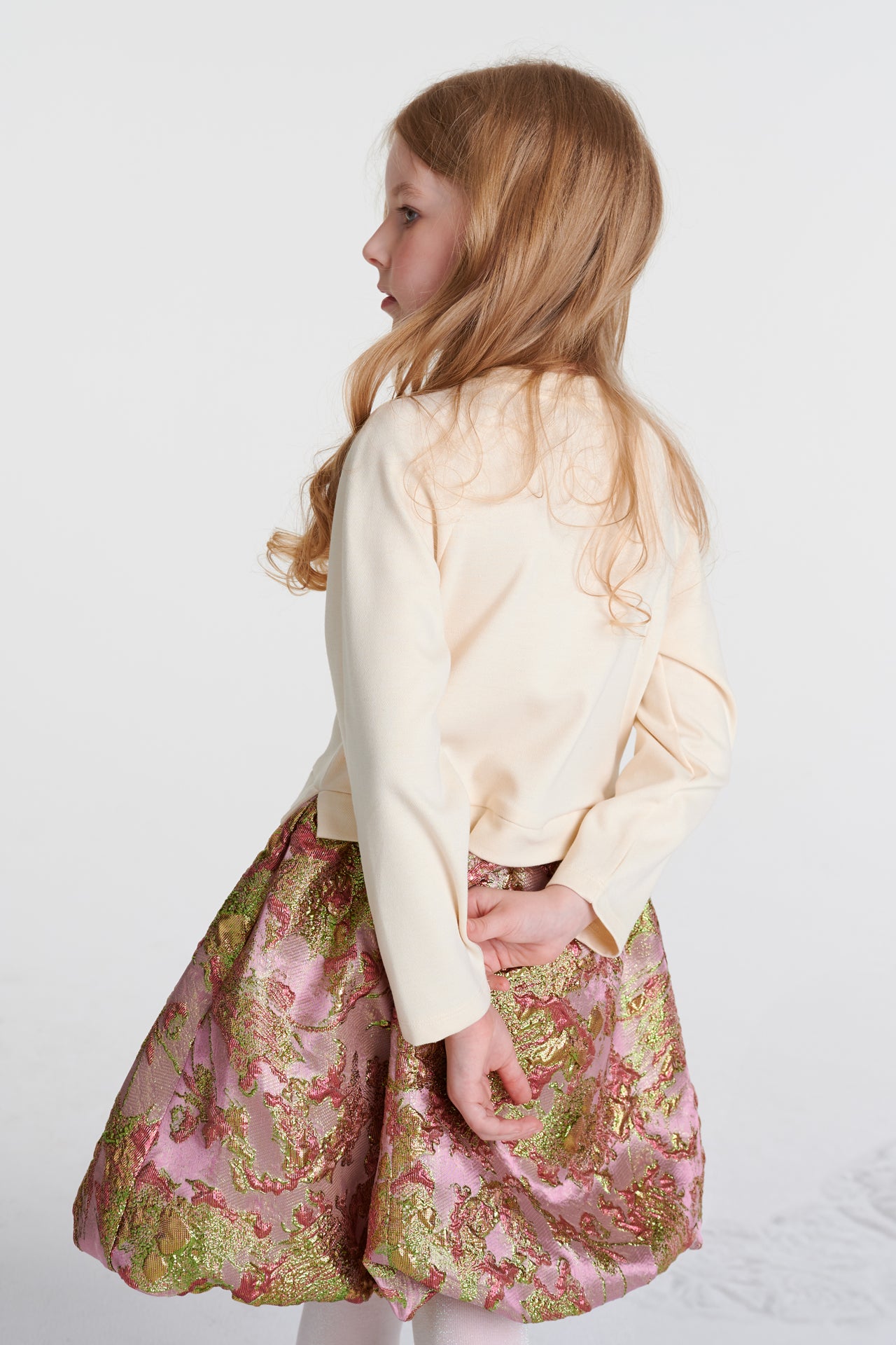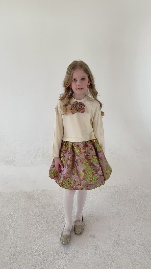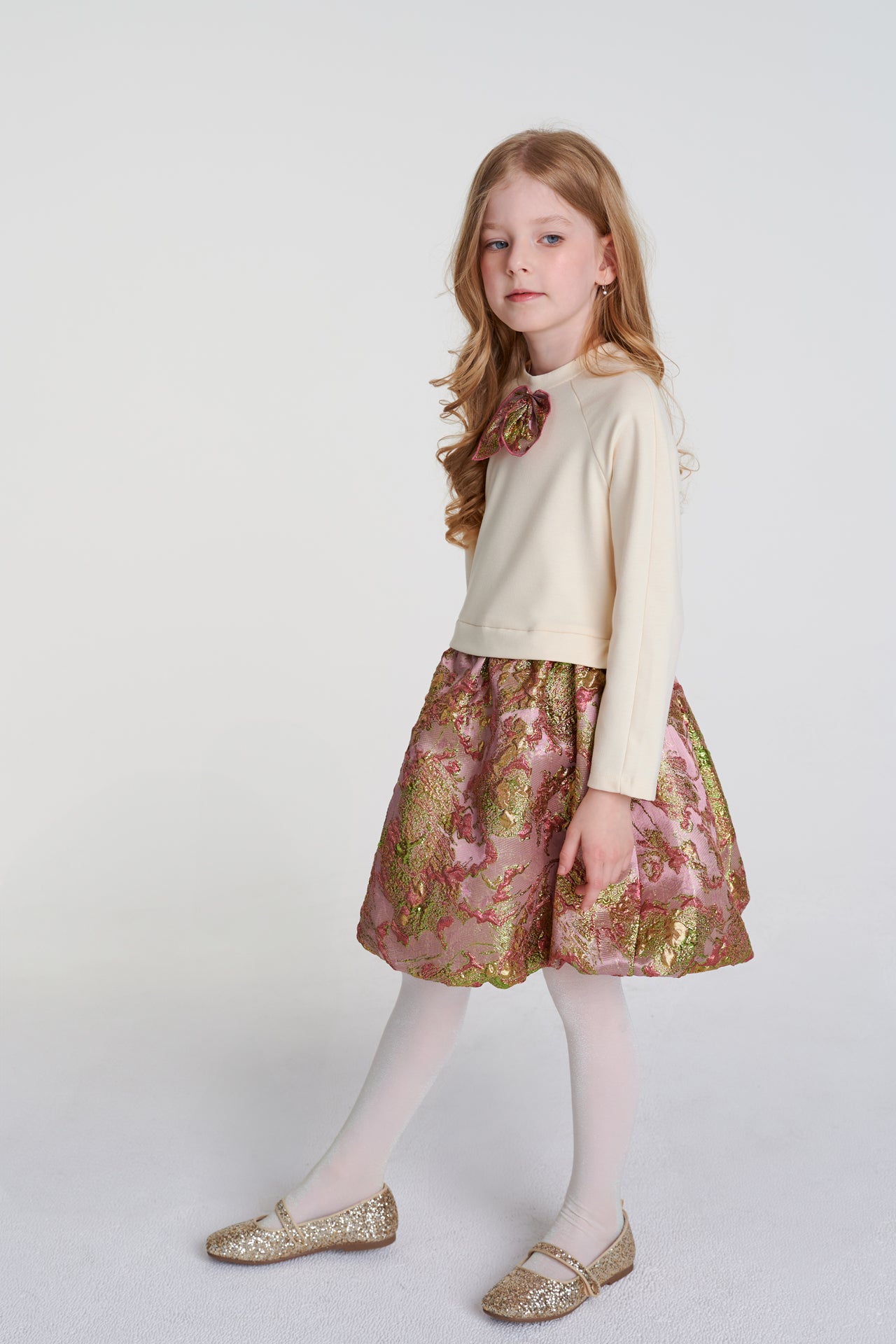 Jakar kız çocuk ebisenin üst bedeni esnek örme kuşatır. alt kısmı ise altın rengi jakar kumaştan imal edilmiştir. Yine etek kısmındaki jakar kumaştan göğüs kısmında fiyonk detayı vardır.