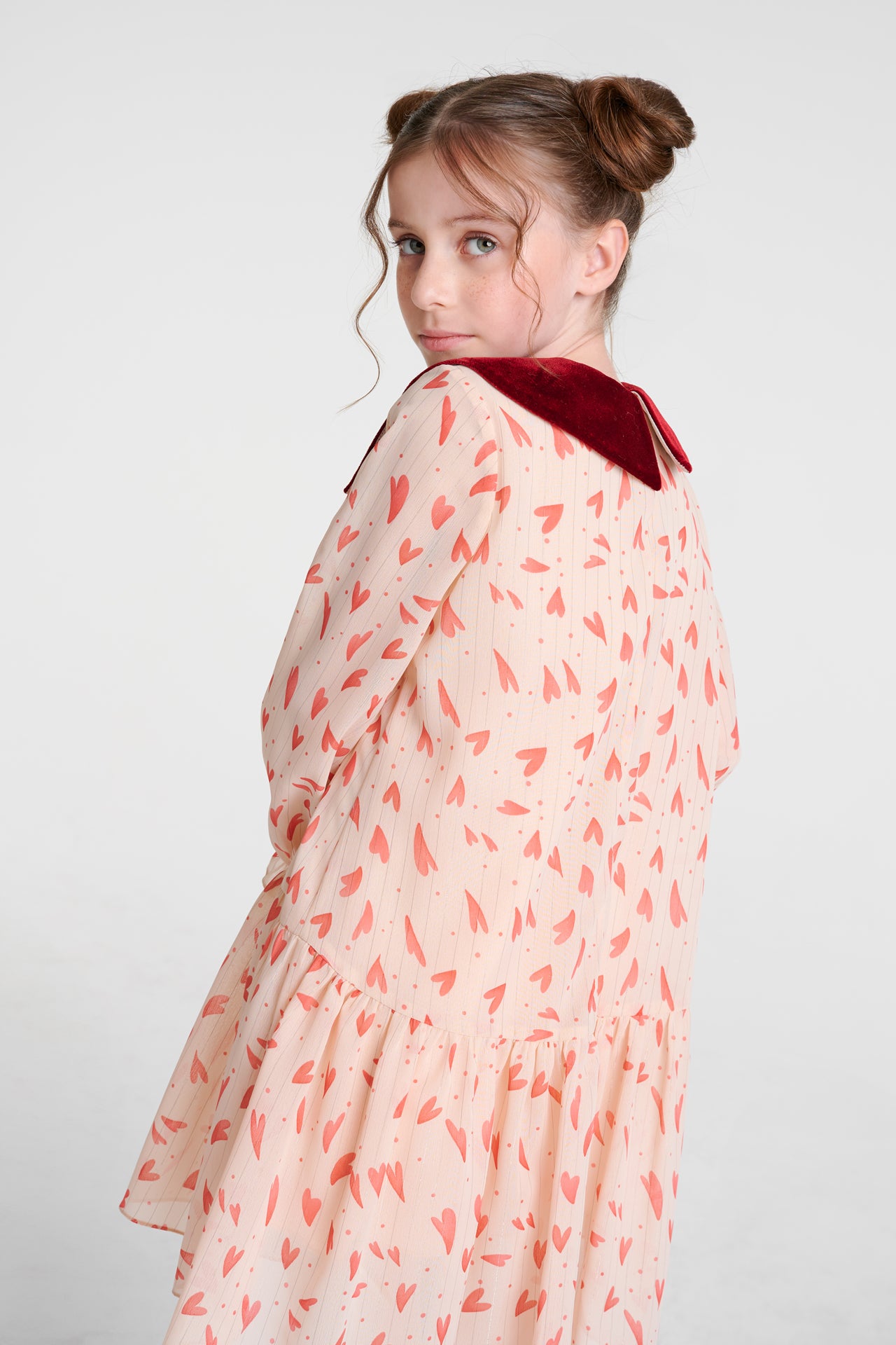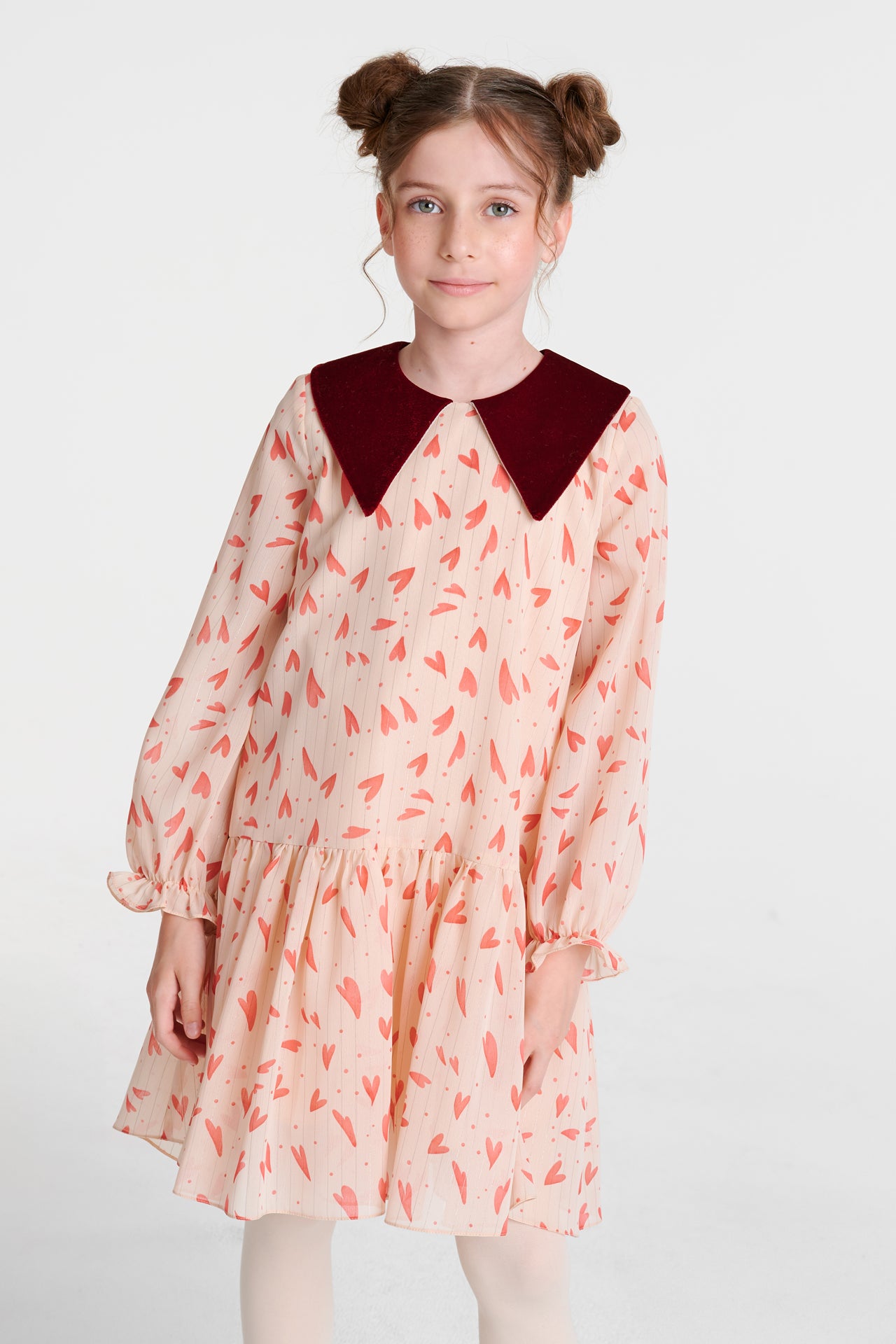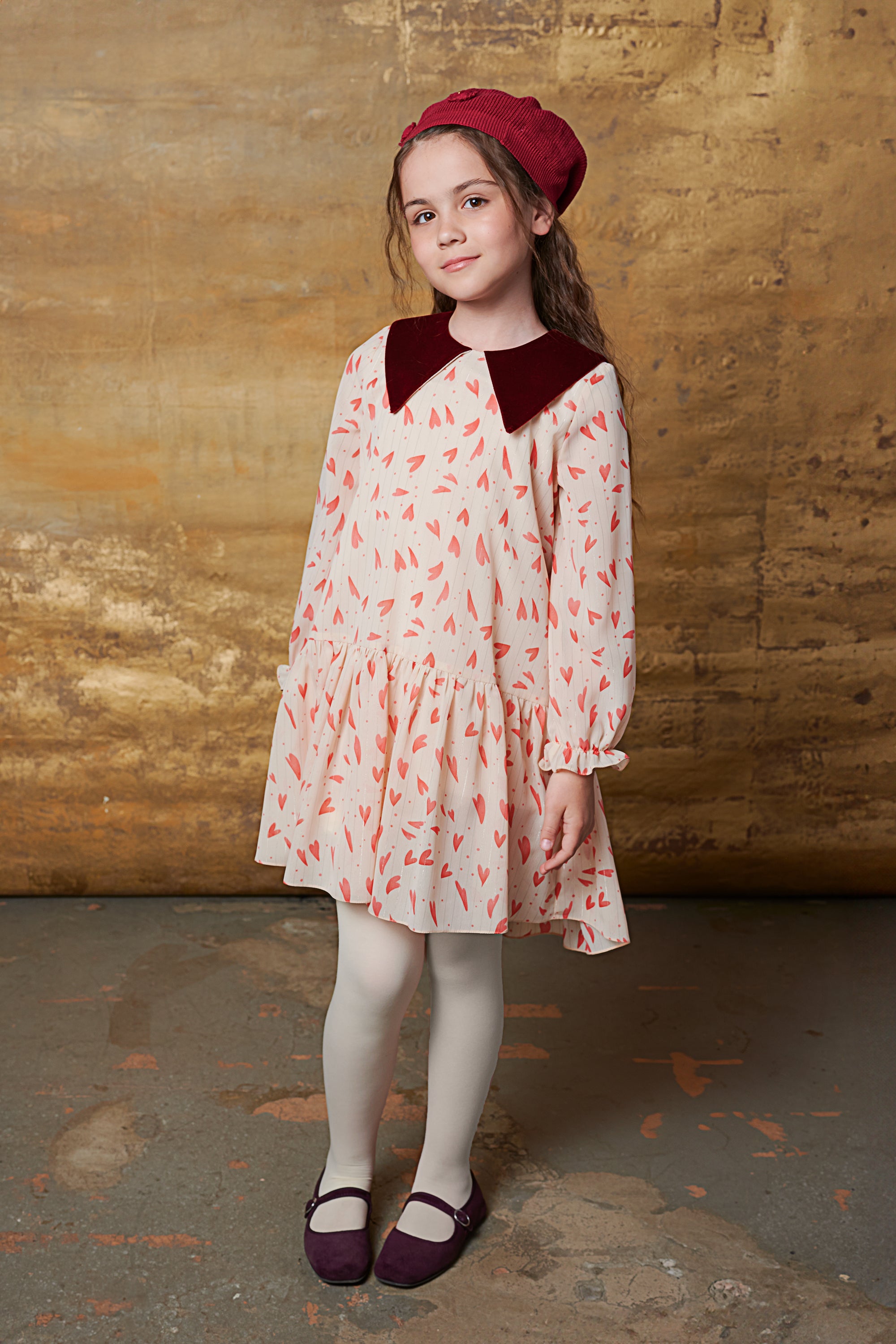 Kalp Desenli şifon kız çocuk elbise. Yakası bordo kadifedir.