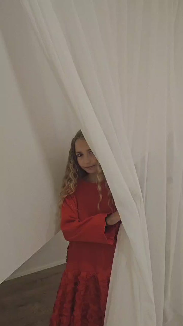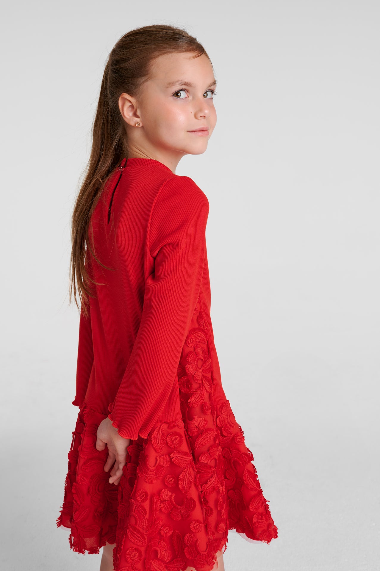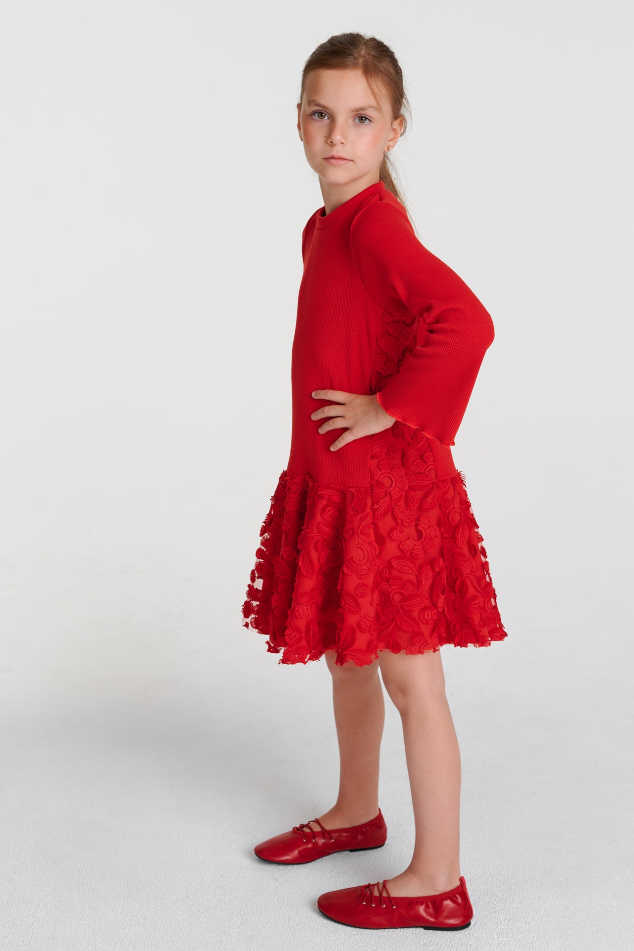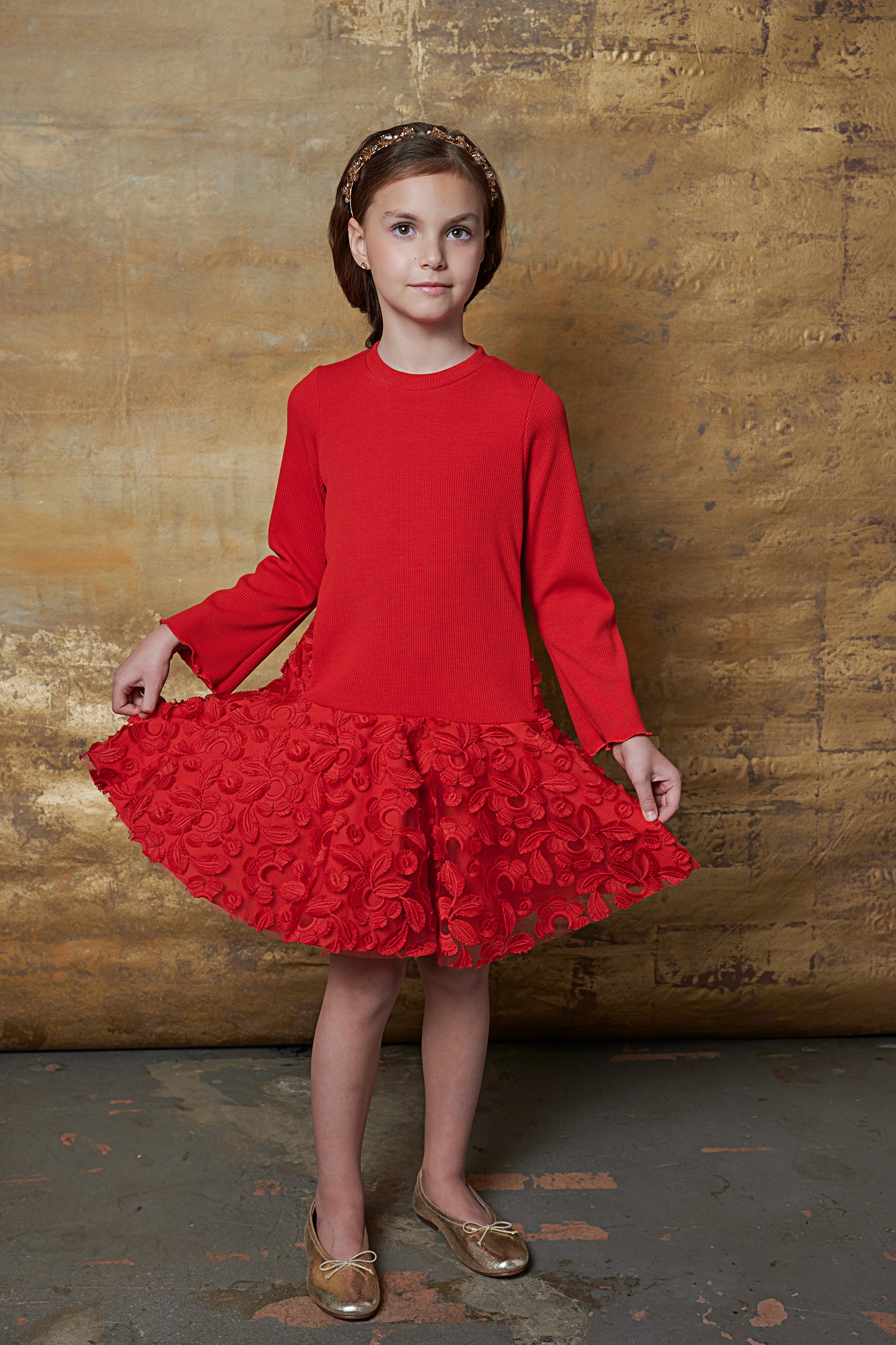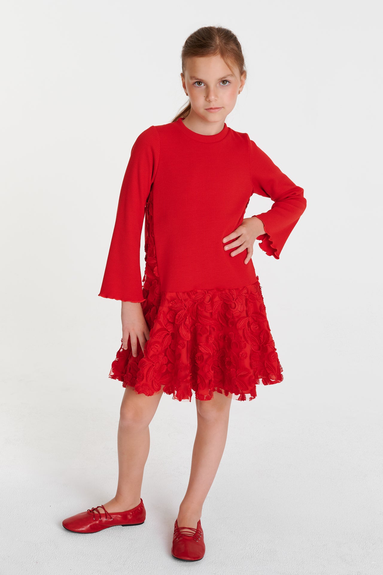 Kırmızı dantel detaylı kız çocuk elbisenin ana bedeni örme kumaştan ve rahat kalıptor. astarsızdır.