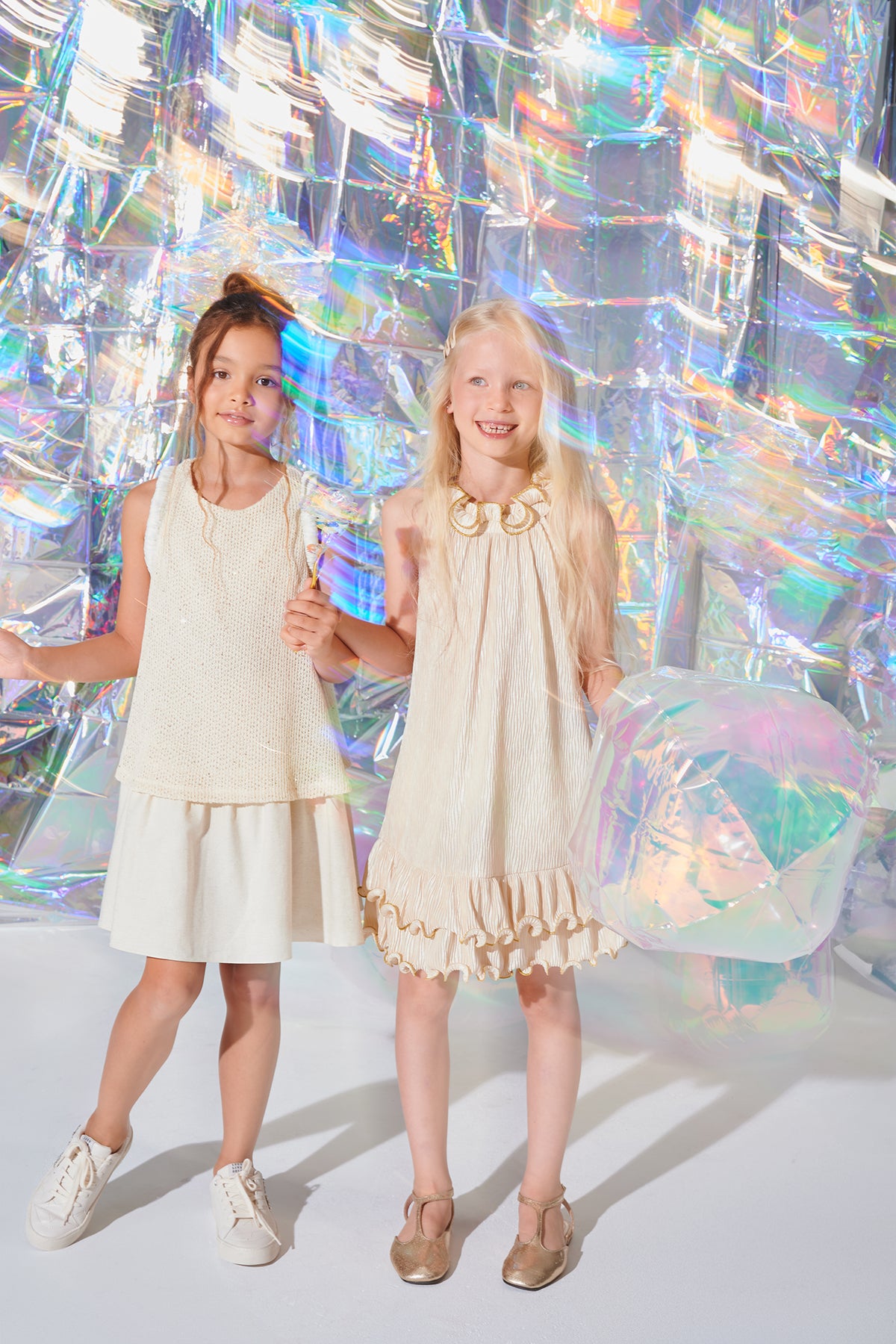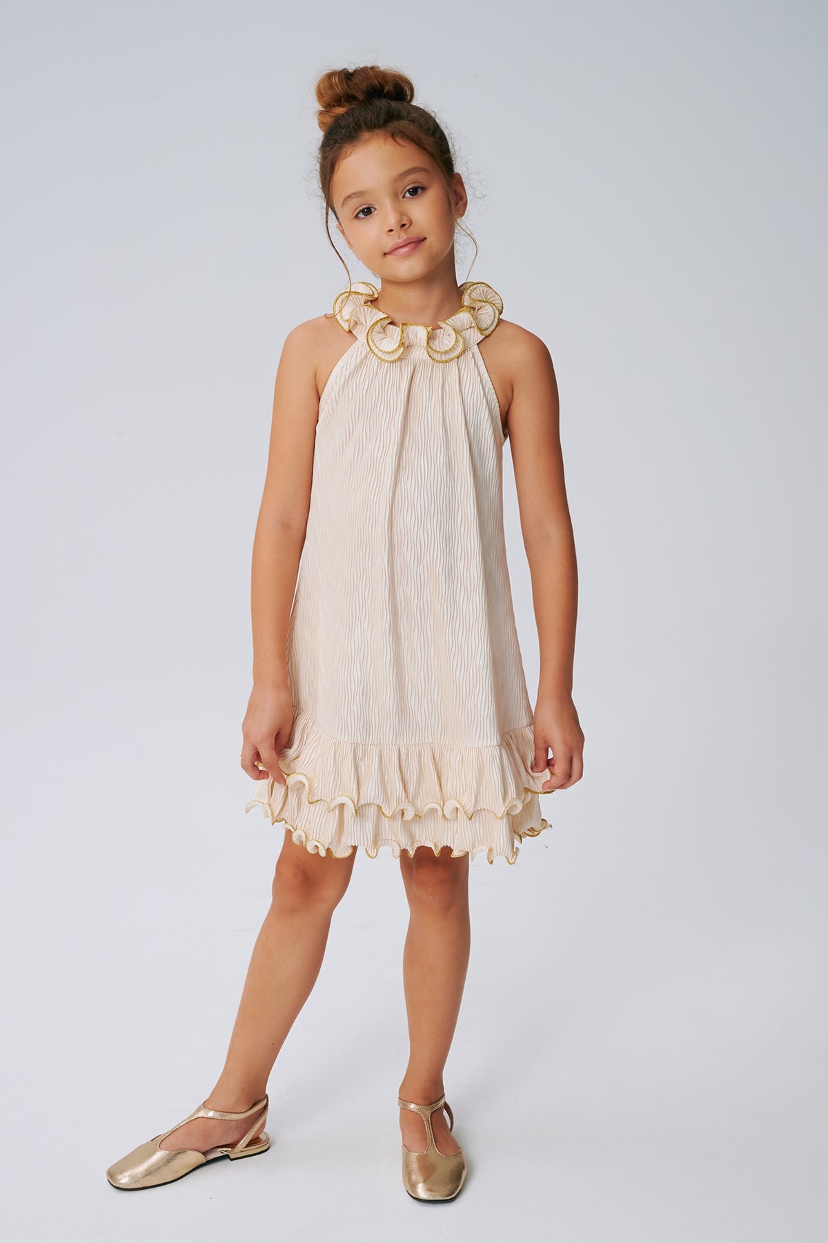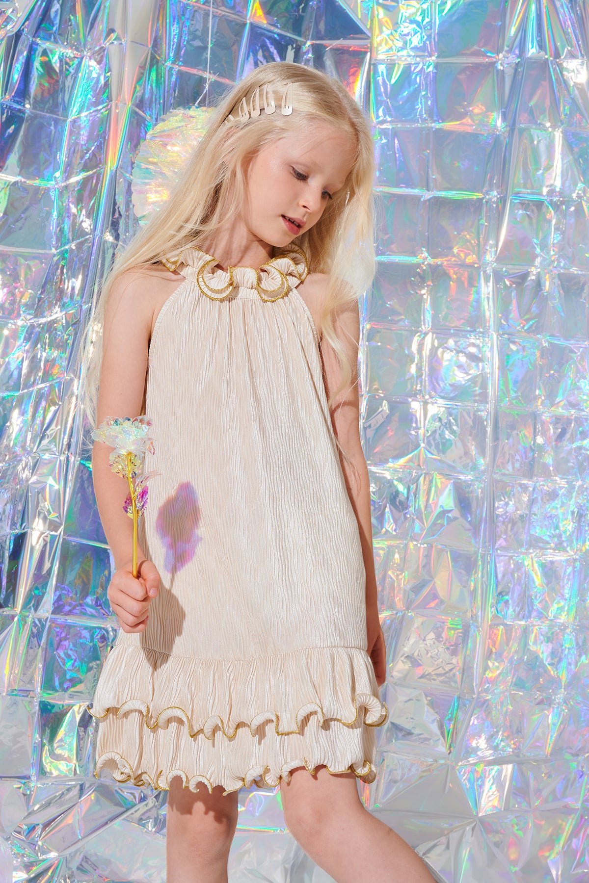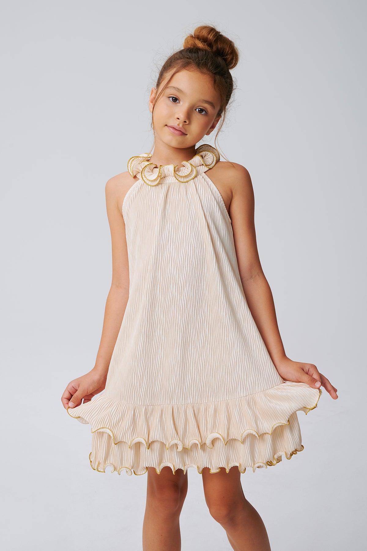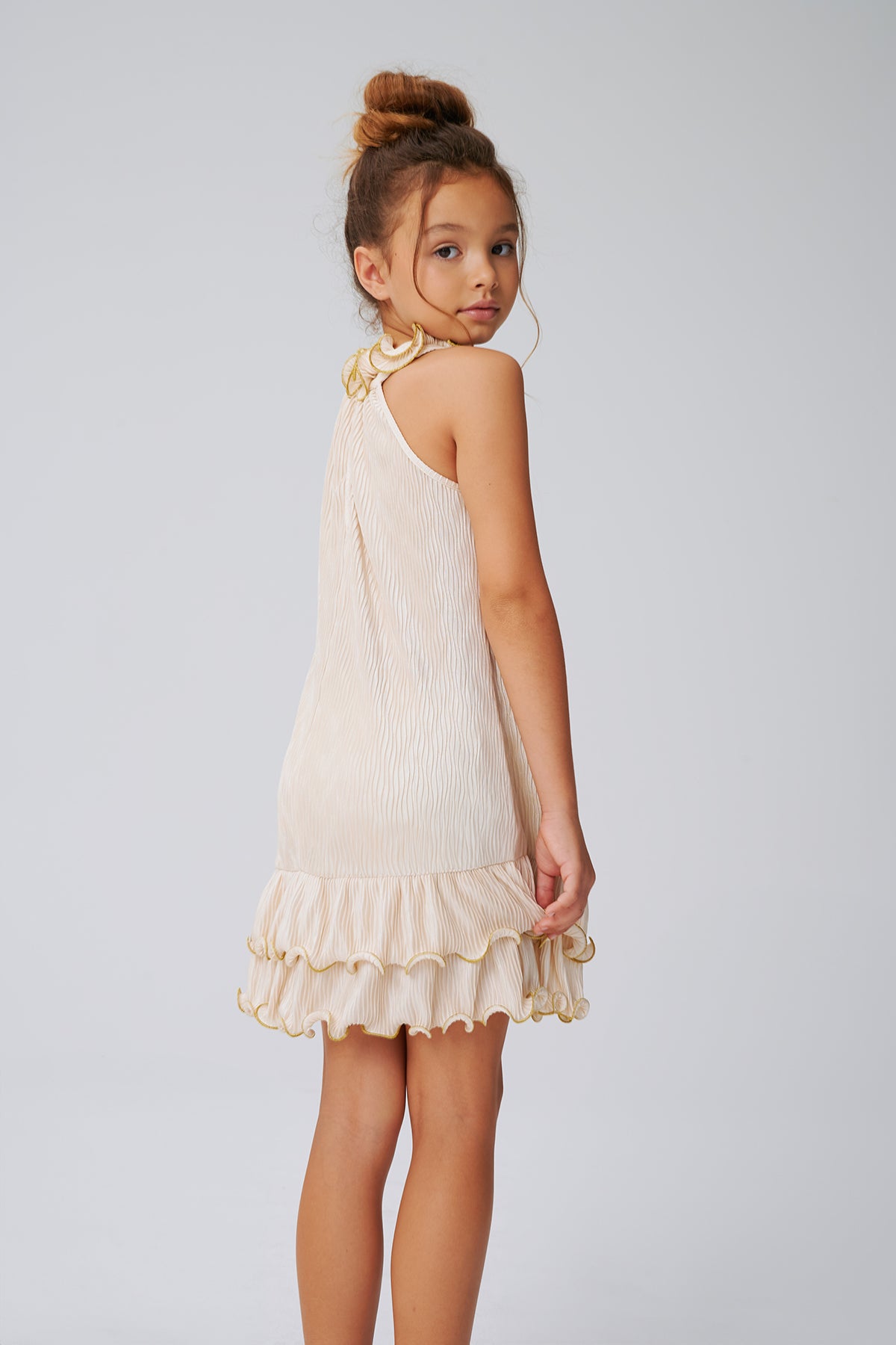 Krem rengi ışıltılı pileli kumaştan tasarlanmış parti elbises. Yakası halter yakadır ve enseden biye ve düğmesi vardır. Model 8 yaşındadır ve 7-8 Yaş beden giymektedir. Boy : 132 cm - Kilo : 24 Model Kodu : DSL0547 - KREM IŞILTI PİLİSELİ ELBİSE