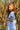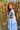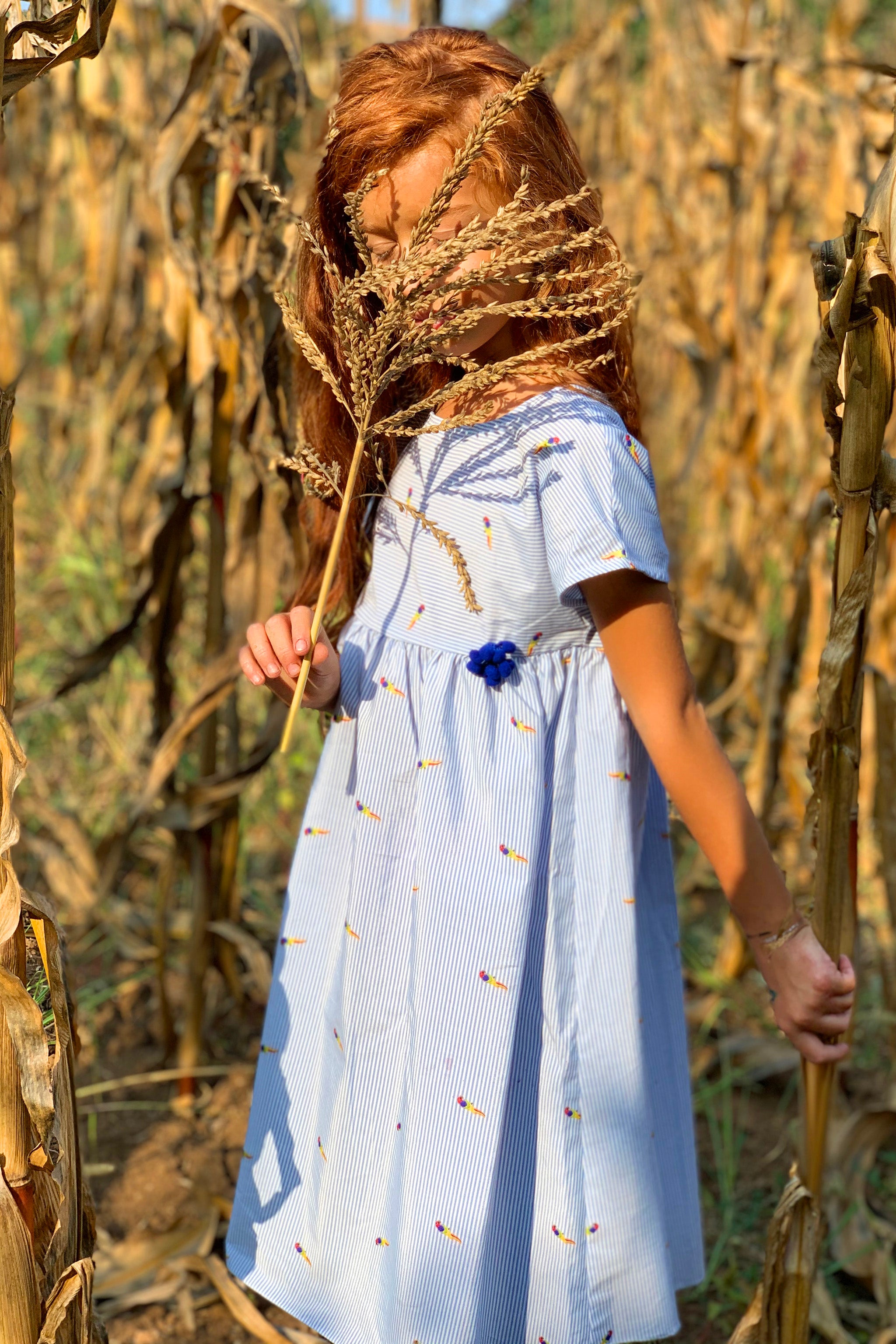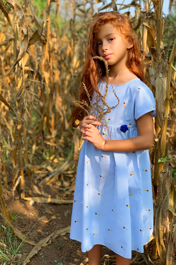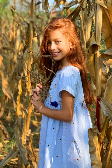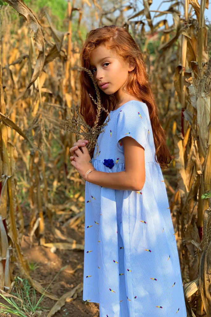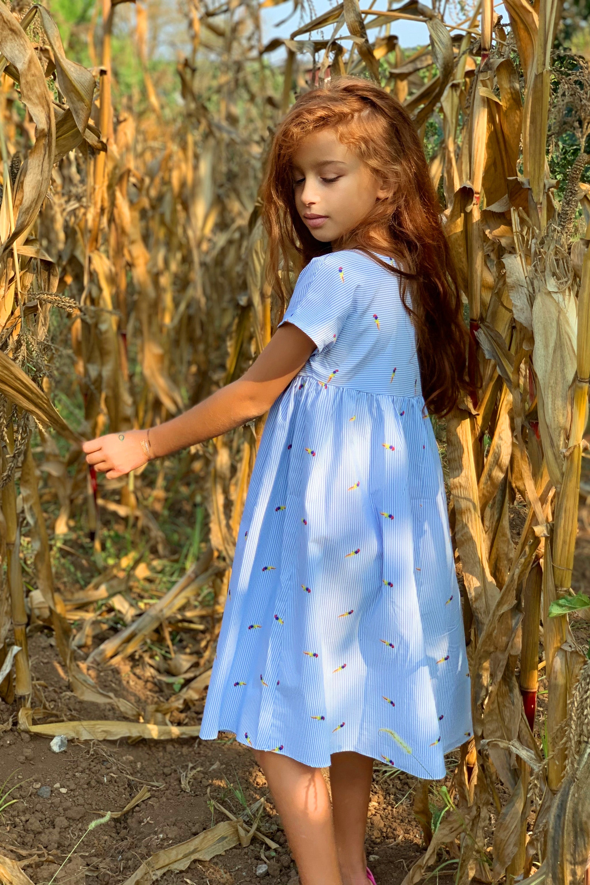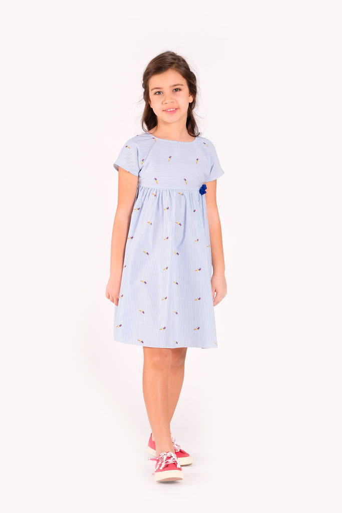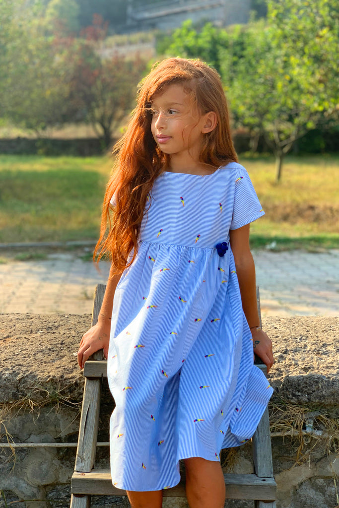 Mavi çizgileri üzerinde küçük papağan kuş nakış işlemeri ve beldeki ponpon aksesuarı ile.