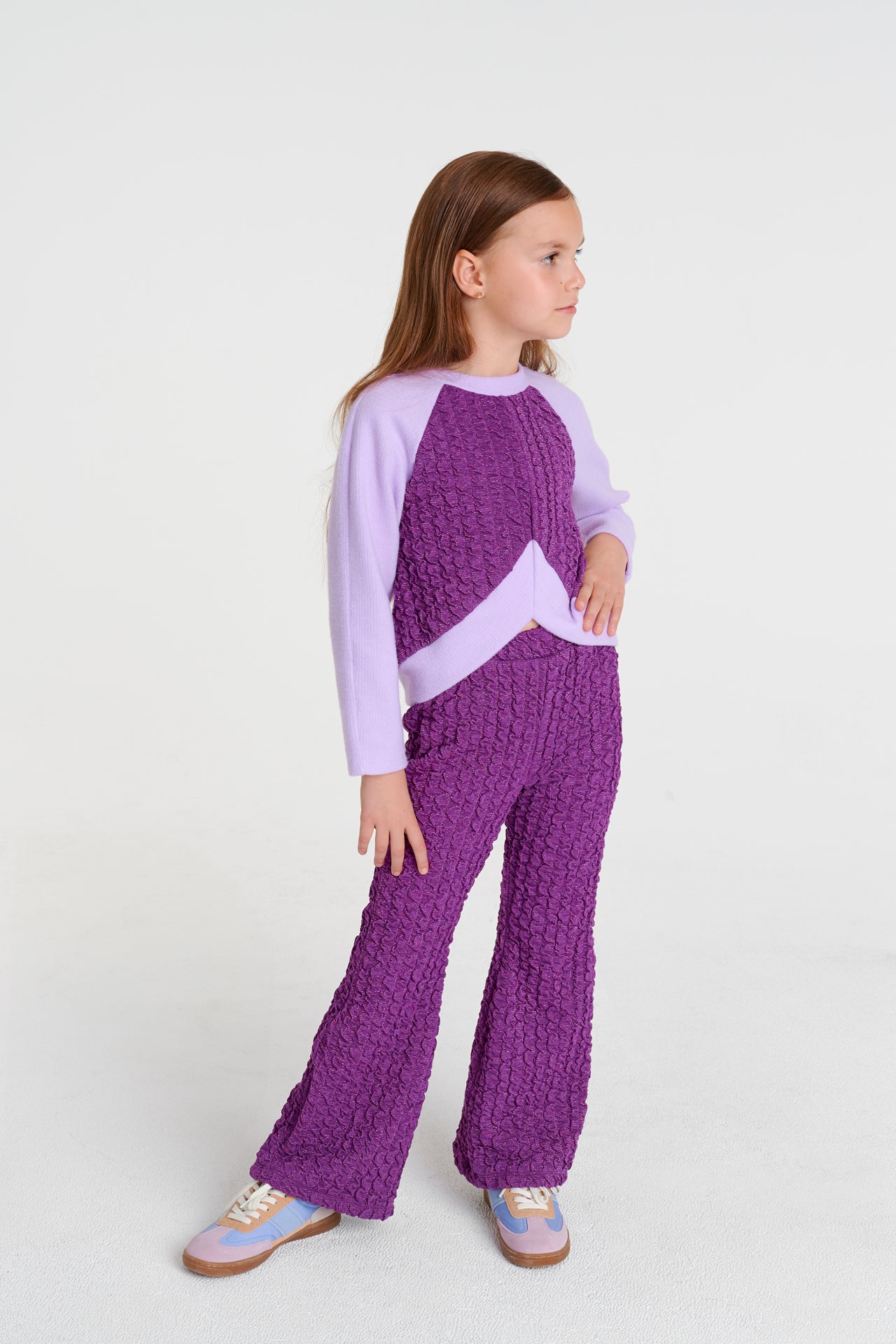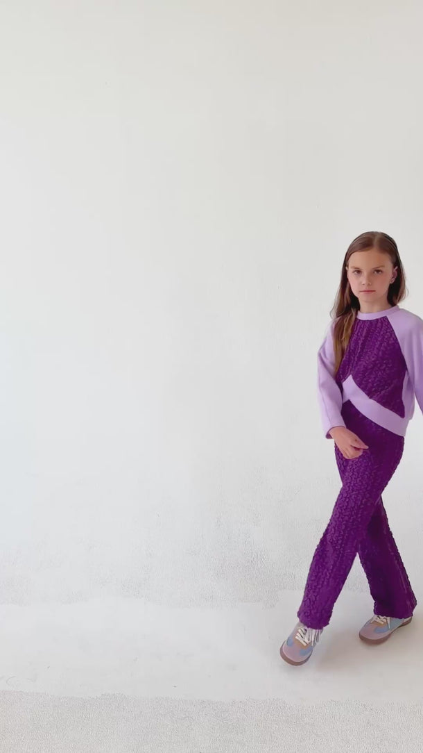 Örme Crop Eşofman üstünün ön kısmı kabartma kapitone kumaştan tasarlanmıştır. Alt kısmı yine örme kumaştandır ve ispanyol paça olarak tasarlanmıştır.