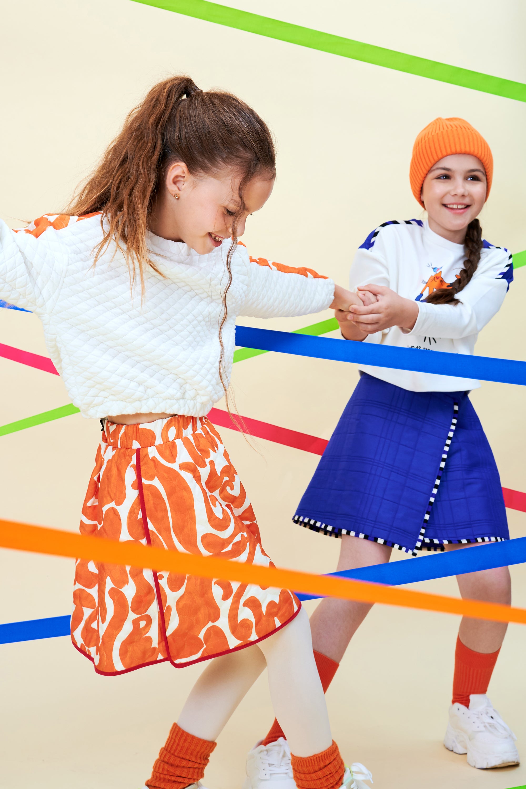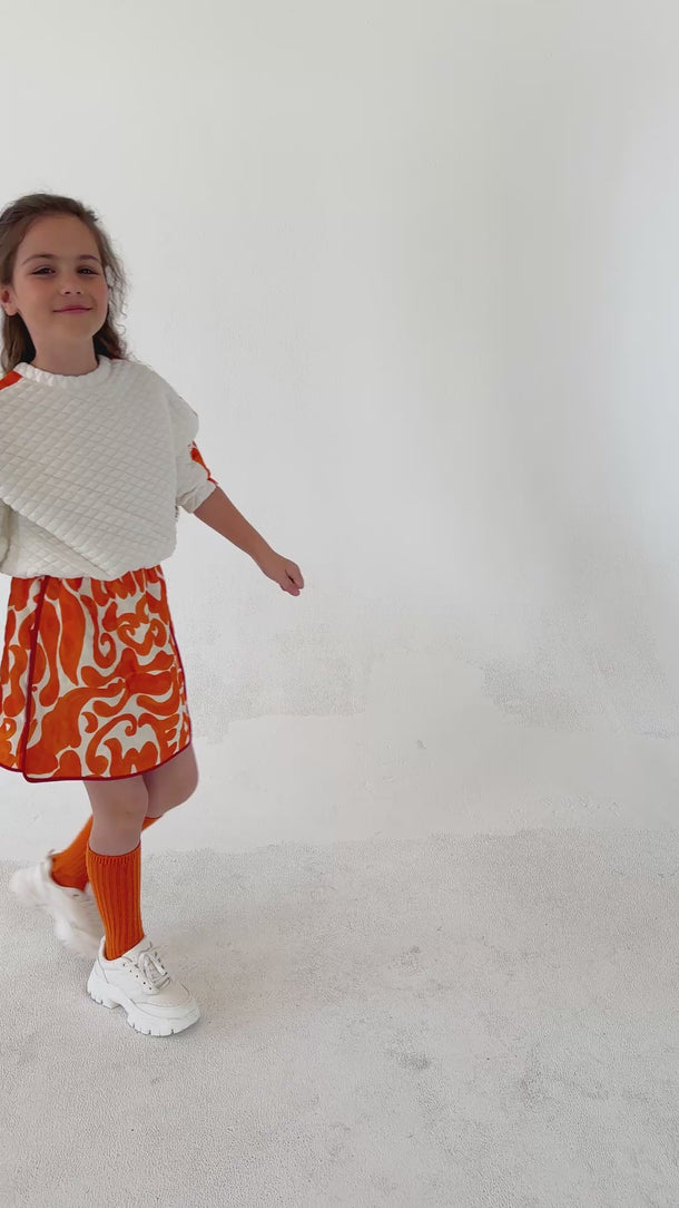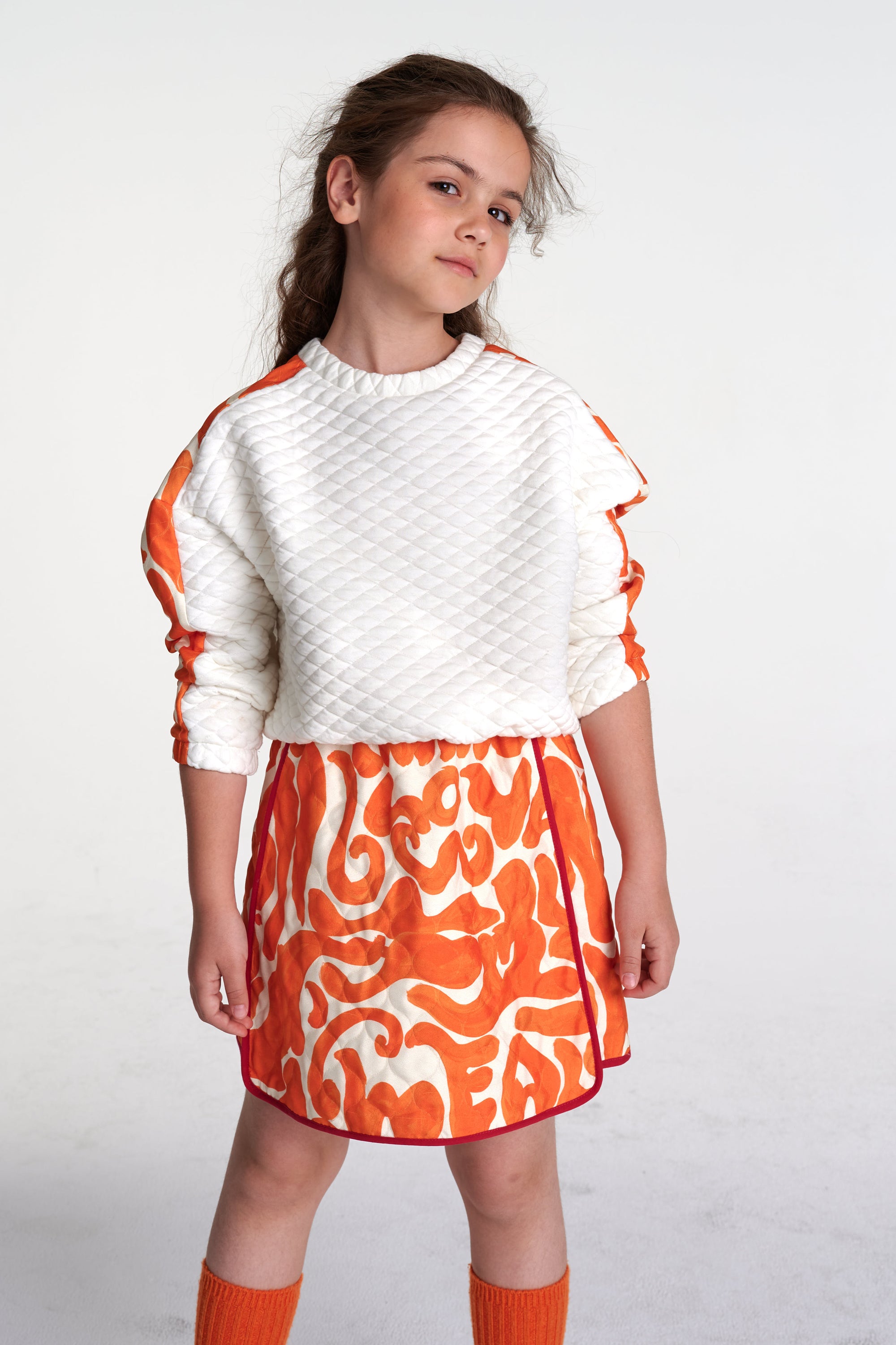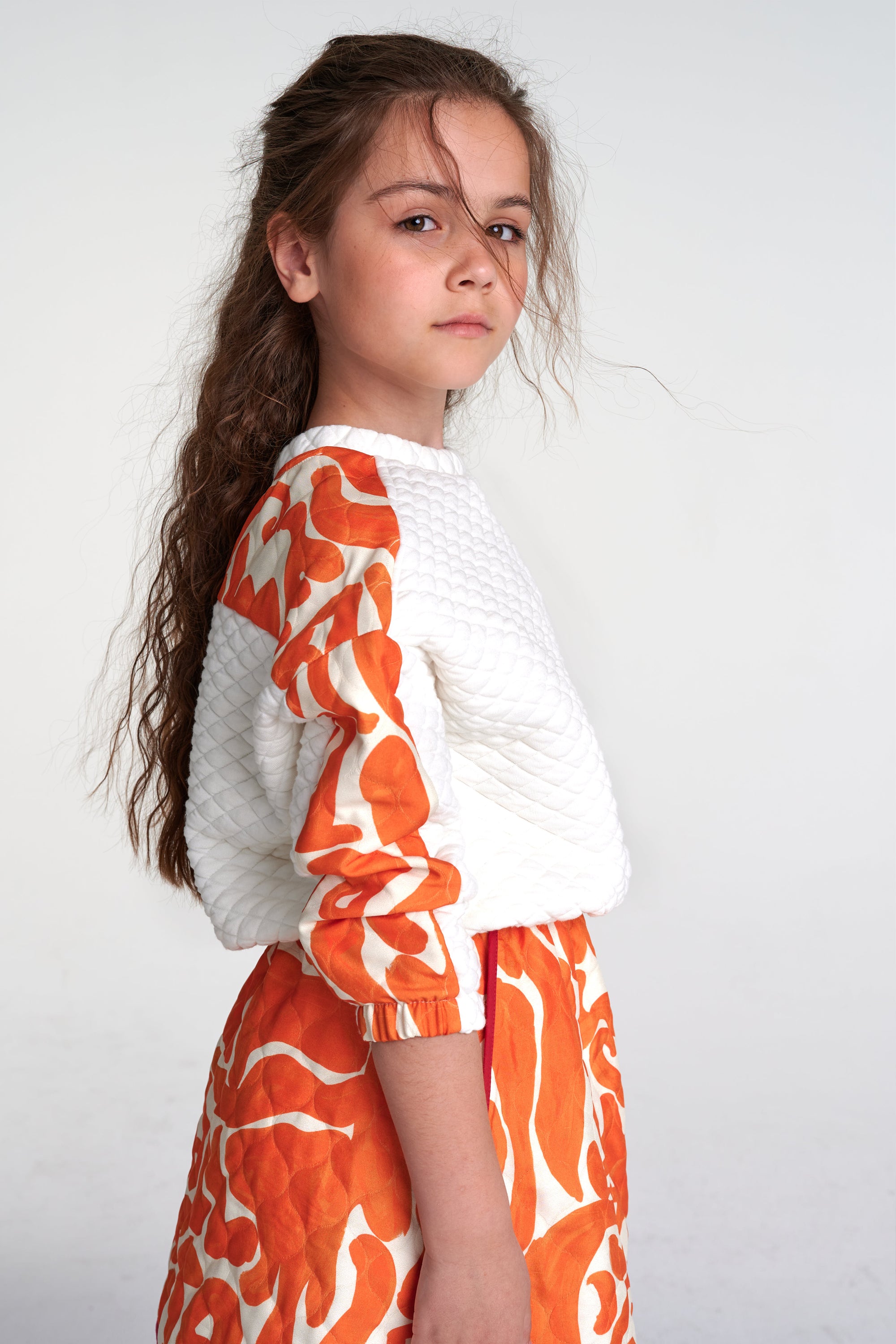 Bluz krem rengi kapitone kumaştan üretilmiştir. Kolları lastikli ve esnektir. Etek kısmı kabartma kapitone kumaştan imal edilmiştir. Beli lastikli ve astarsızdır.