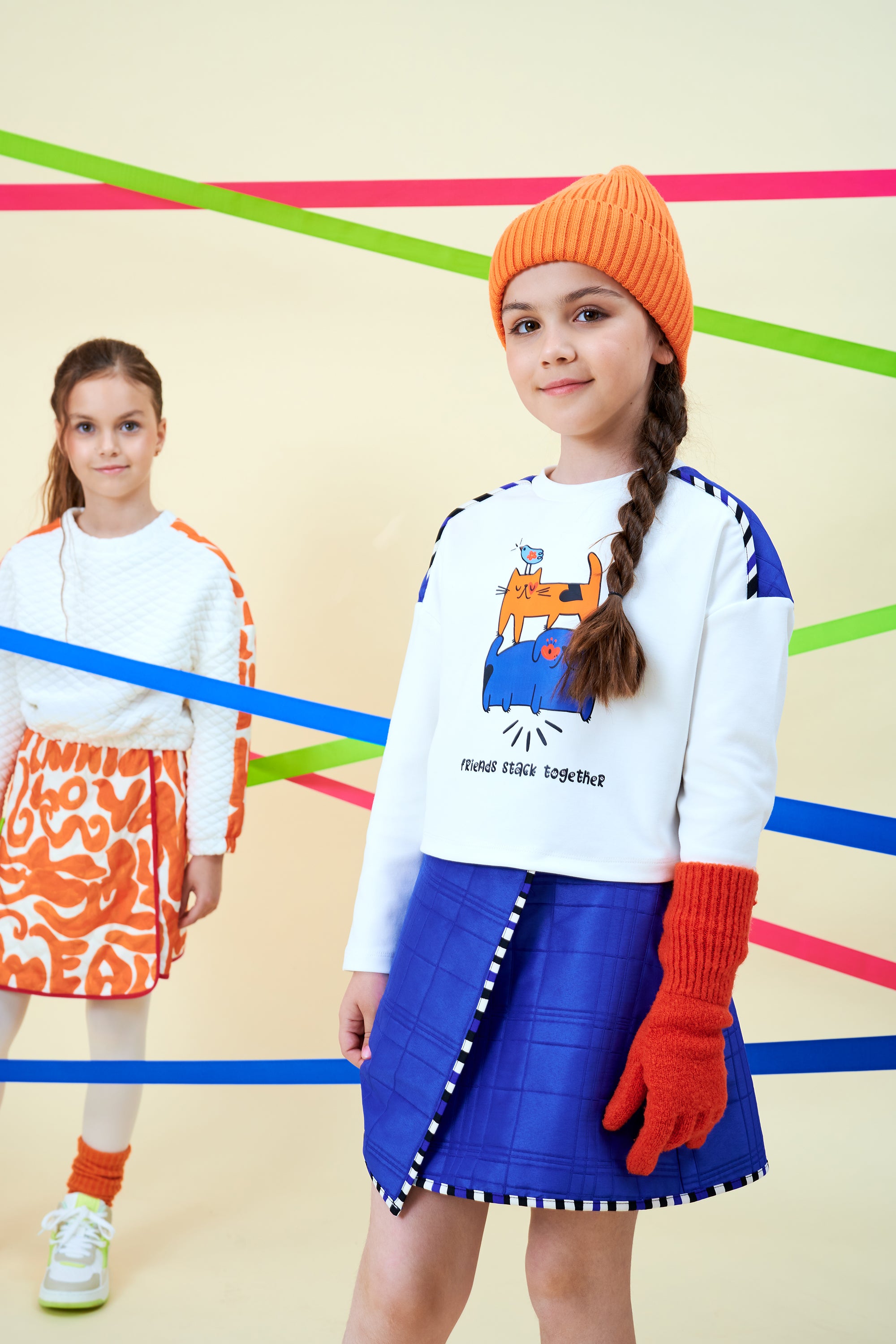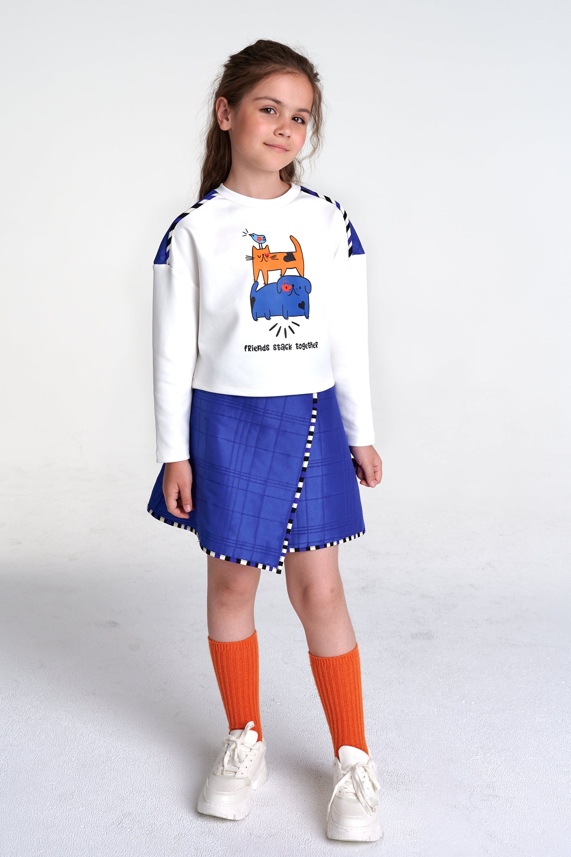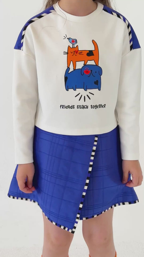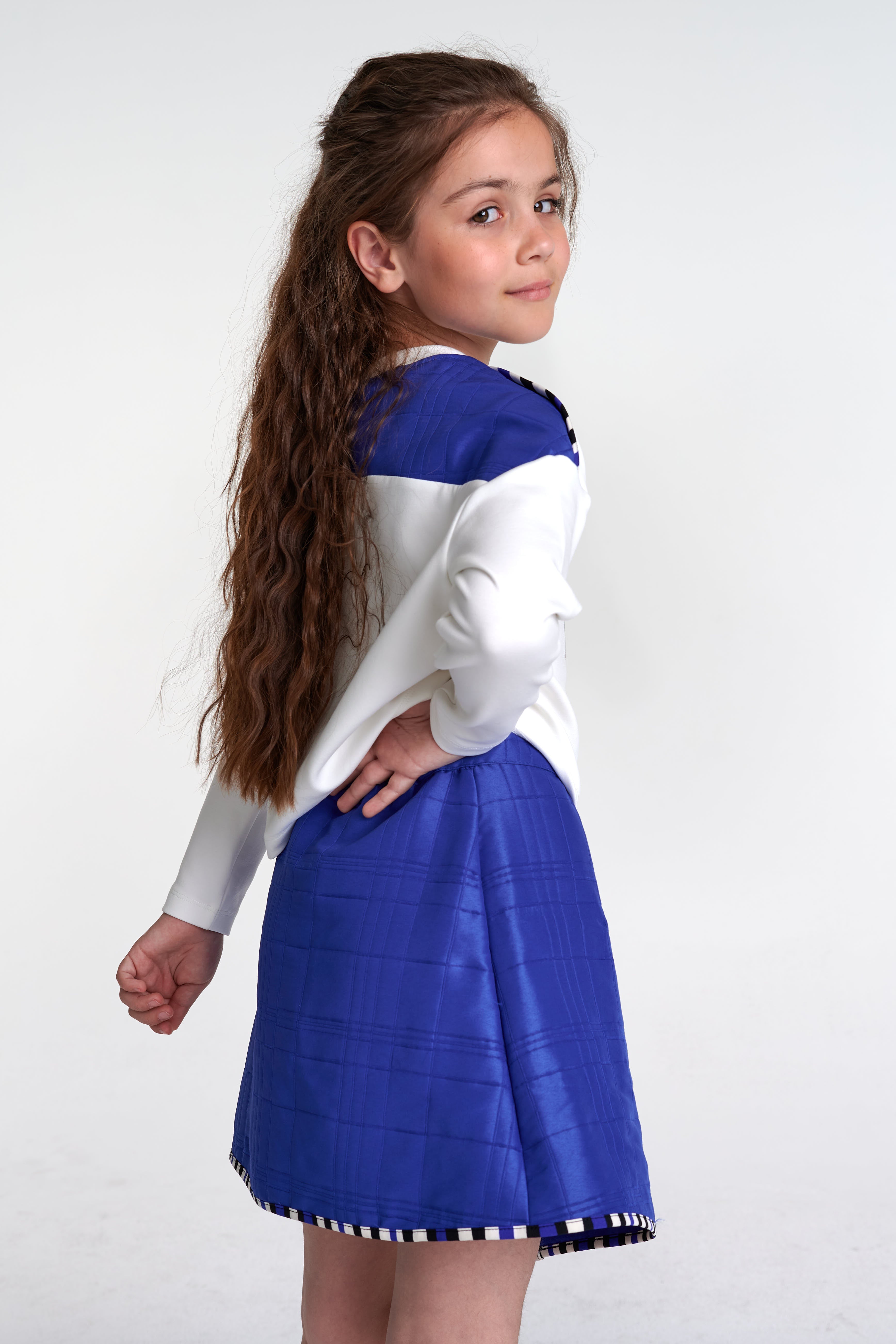 Ekru örme kumaştan imal edilmiş kız çocuk blüzün omuzlarında mavi yama detayları vardır. Bu takımın eteği ise kabartma detaylı kapitone kumaştan envelope tarzı tasarlanmıştır. Astarsızdır.