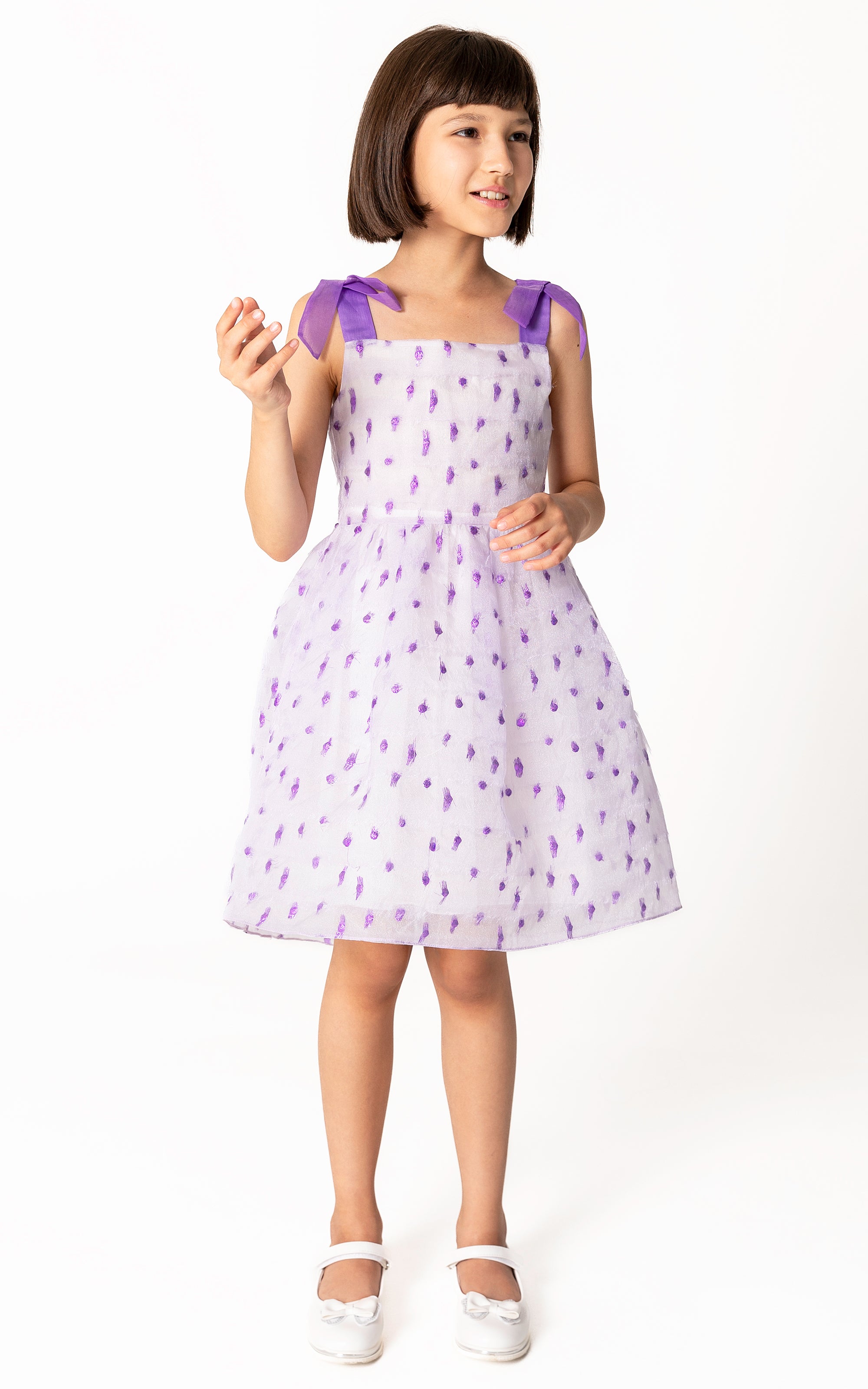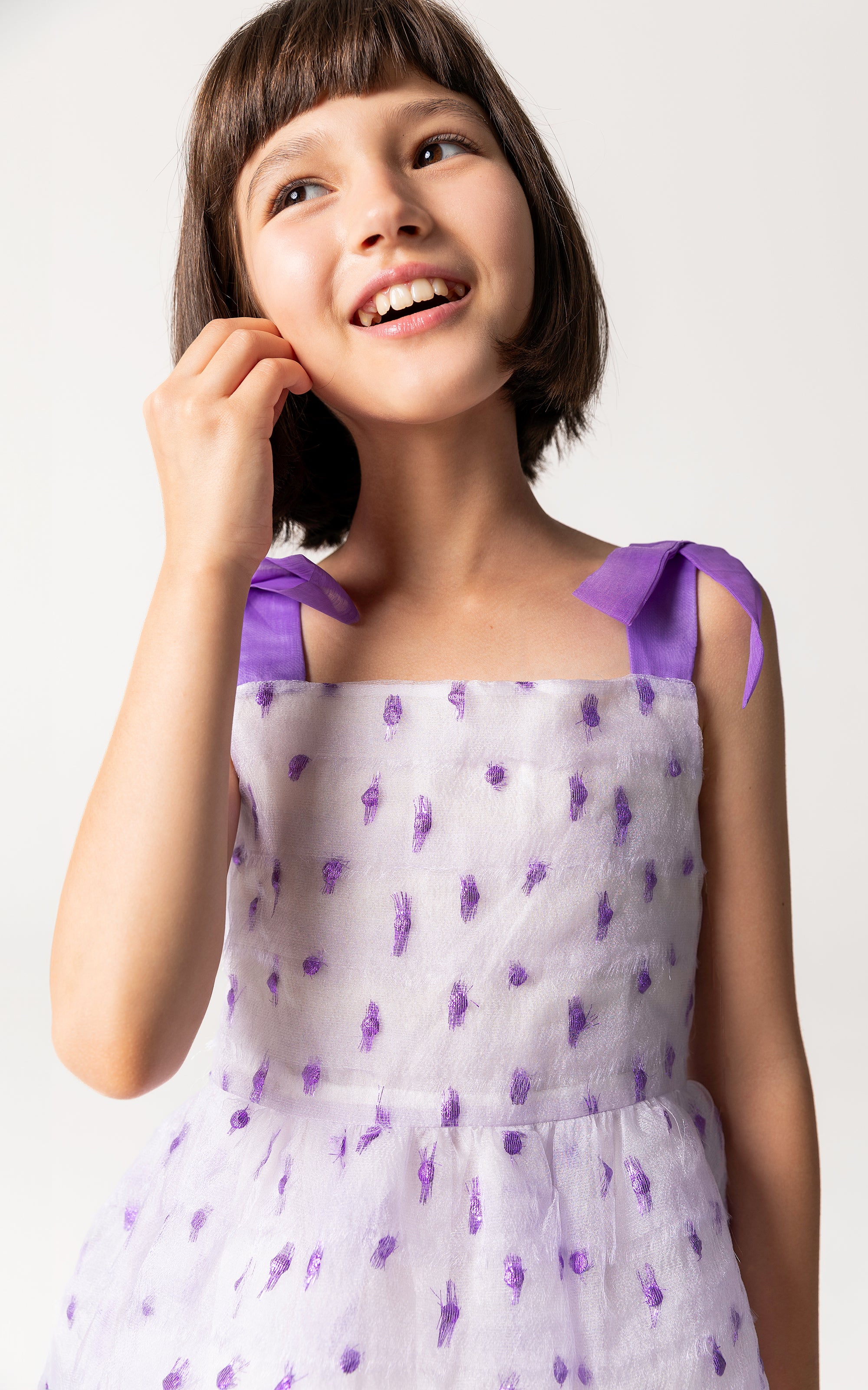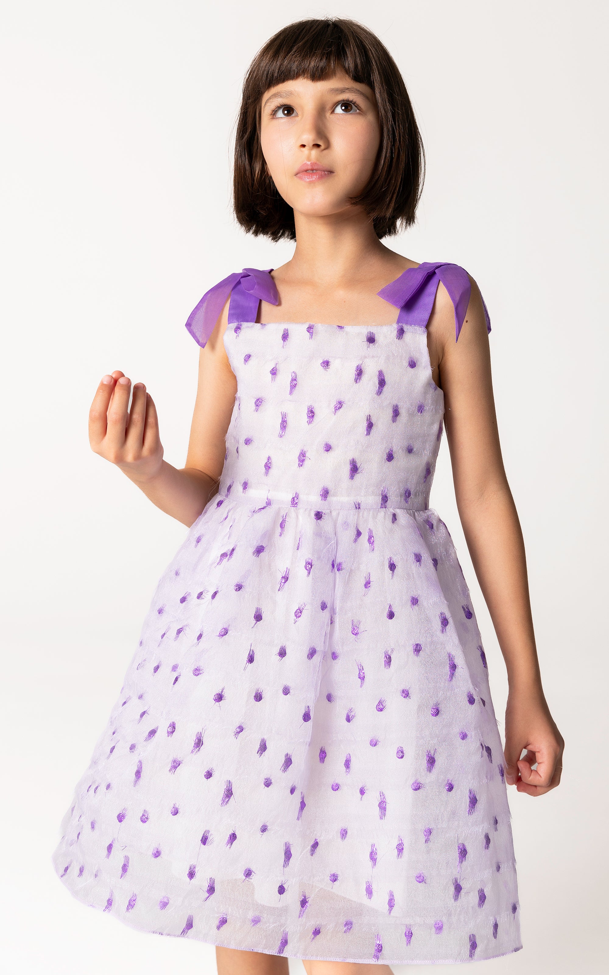 Lila tül üzerine simli mor benekleriyle dikkat çeken bu diz boyu kabarık etekli parti elbisesi, elegant kalıbı ve özel kumaşıyla göz alıcı bir tasarım sunuyor. Mor renk, askılardaki fiyonk detayıyla da taşınarak şıklığı tamamlıyor. Özel günlerde giyilebilecek bu elbise, hem rahat hem de etkileyici bir tarz arayanlar için mükemmel bir seçenek