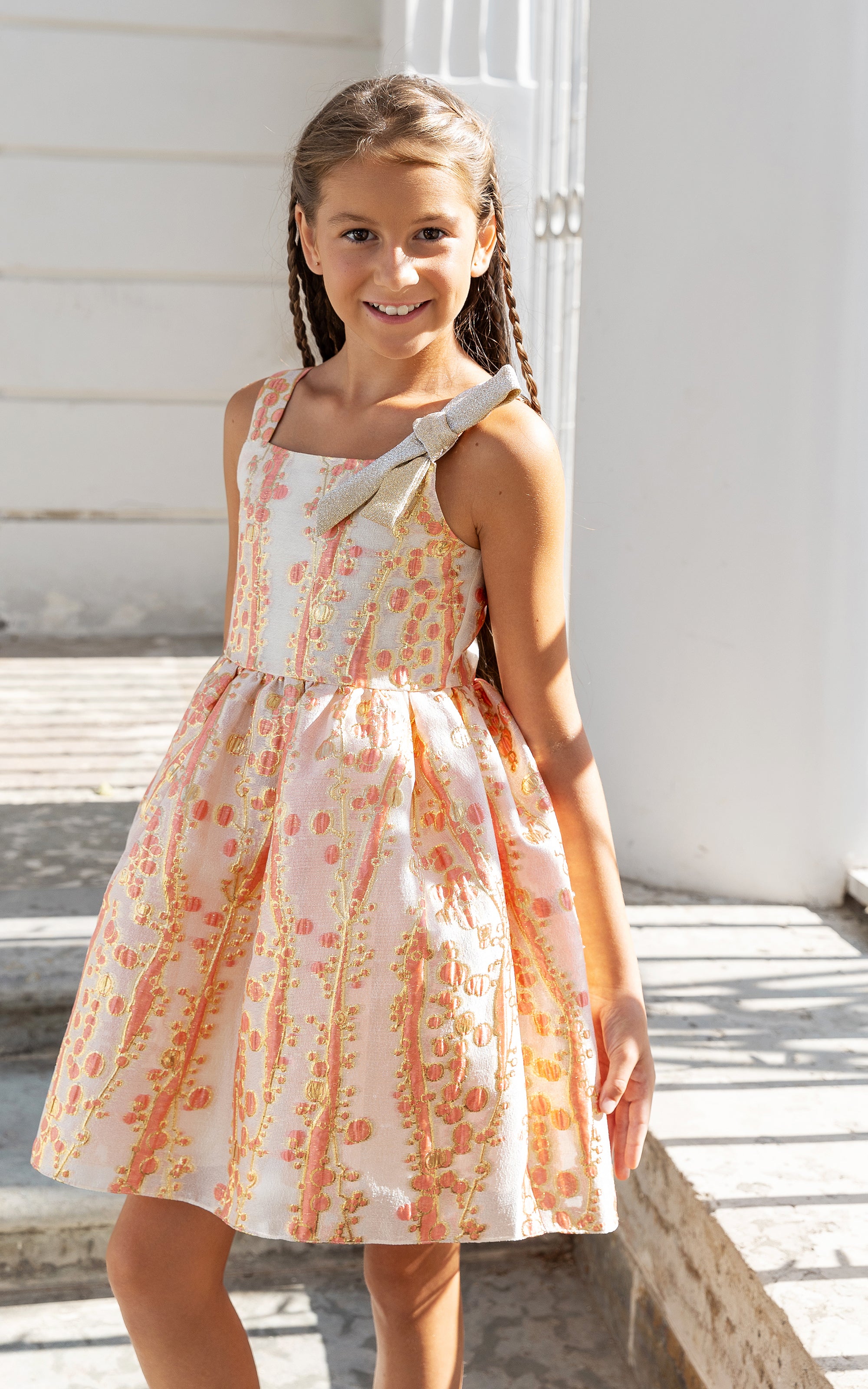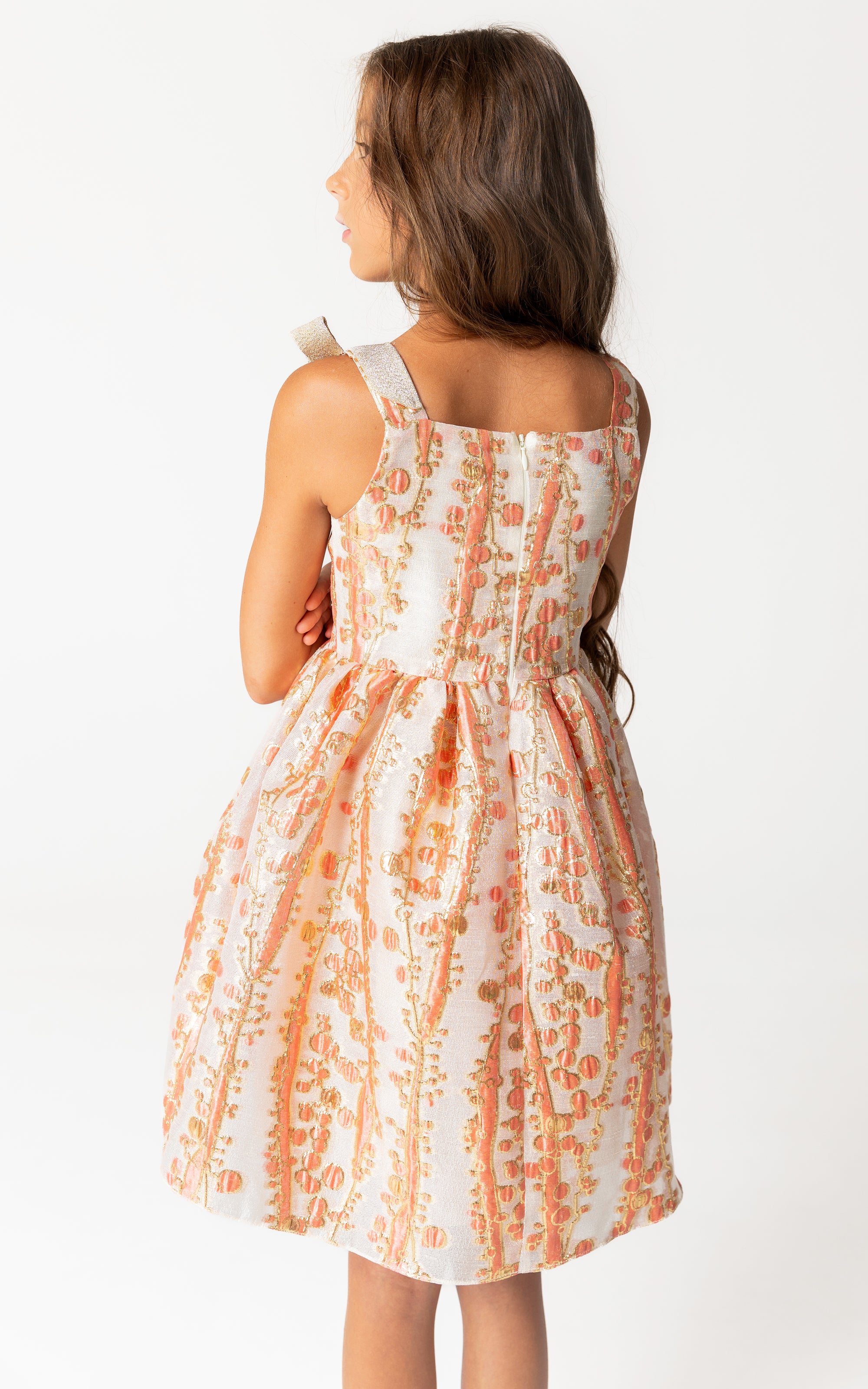 Şeftali tonlarında kabartmalı parlak jakar kumaşıyla dikkat çeken bu askılı parti elbisesi, %100 pamuk astarı ve arka fermuarıyla hem rahat hem de şık bir seçenek sunuyor. Özel günlerde giyilebilecek bu elbise, zarif tasarımı ve parlak dokusuyla göz alıcı bir tarz arayanlar için mükemmel bir tercih.