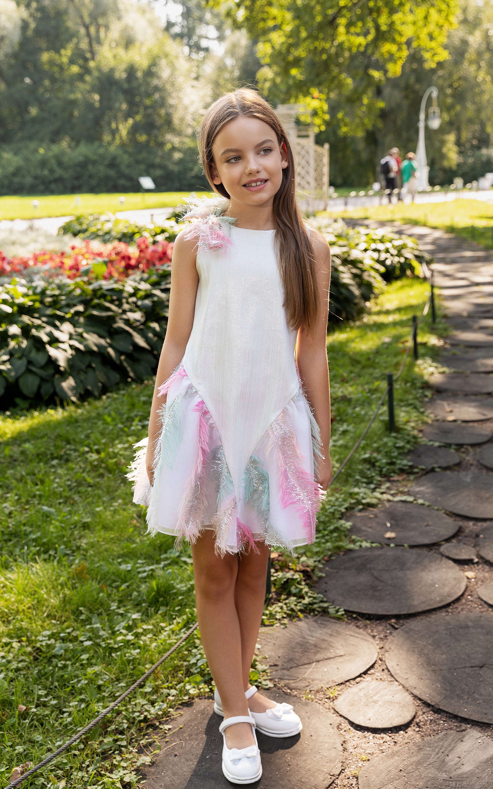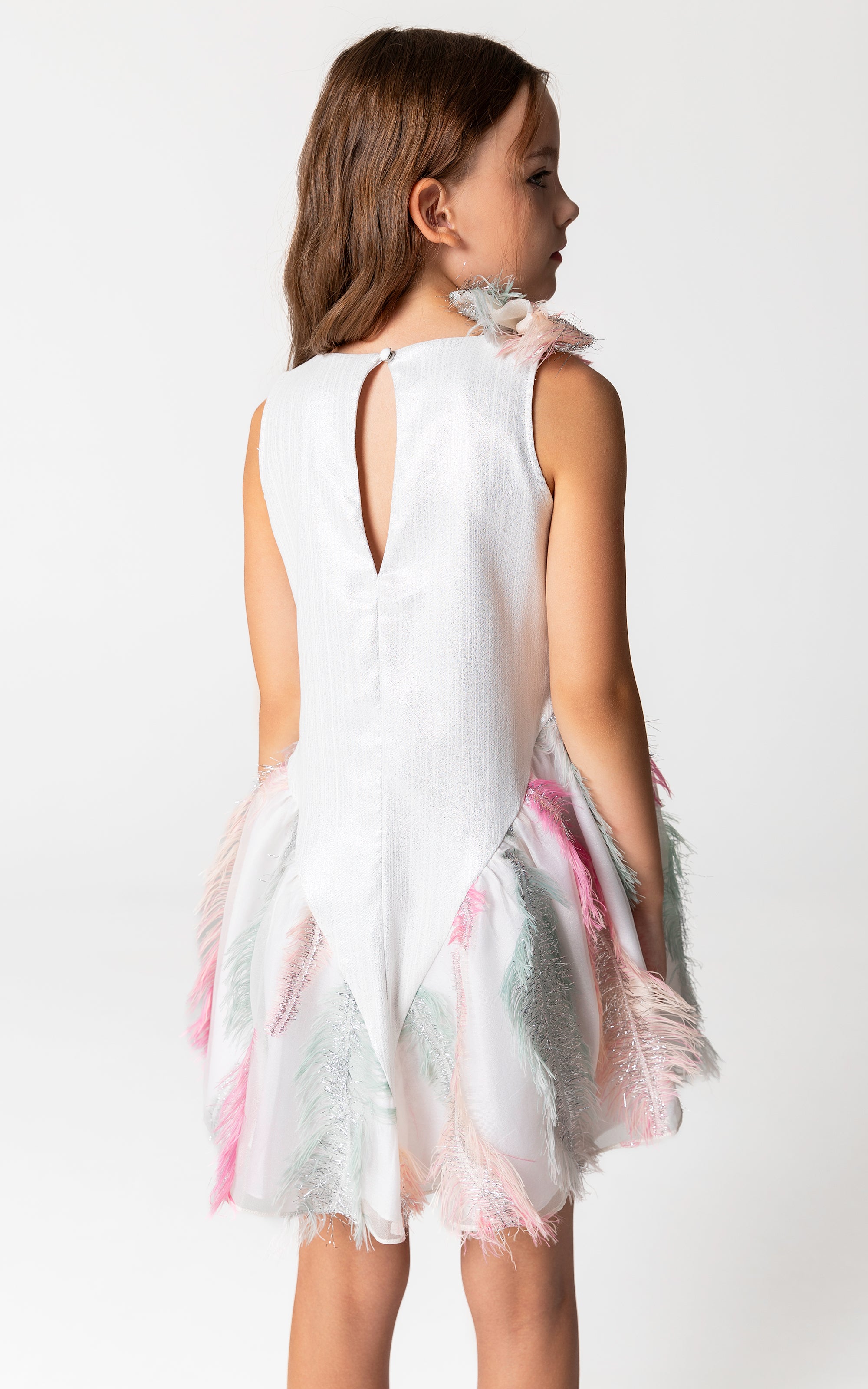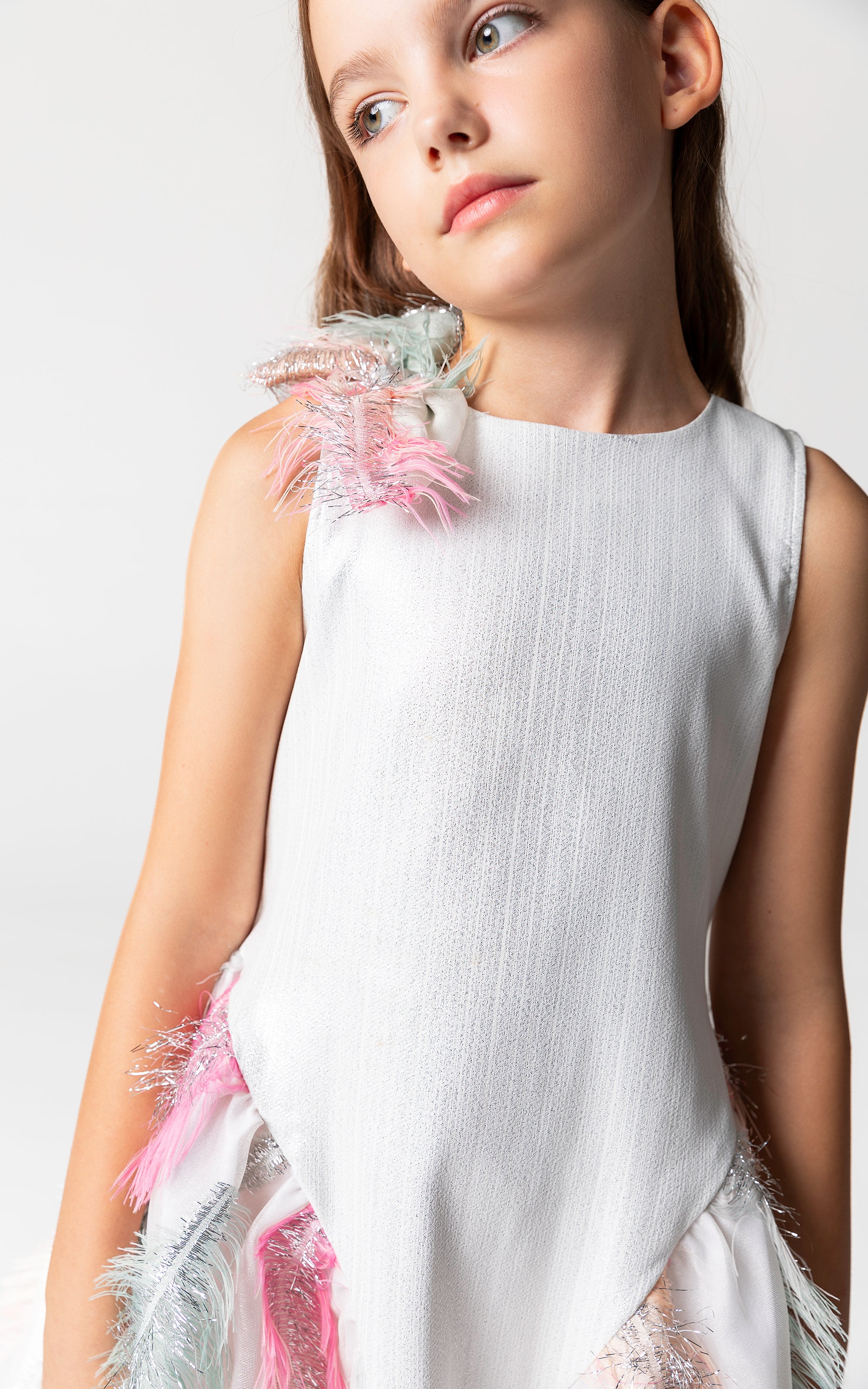 Gövdesi beyaz kumaş üzerine hafif gümüş renkli ışıltılarla süslenmiş bu abiye elbise, etek ucundaki pembe püsküllü tüy efektleriyle göz alıcı bir tasarım sunuyor. Özel günlerde giyilebilecek bu elbise, şıklığı ve zarafeti bir araya getiriyor. Hem modern hem de etkileyici bir tarz arayanlar için ideal bir seçenek.