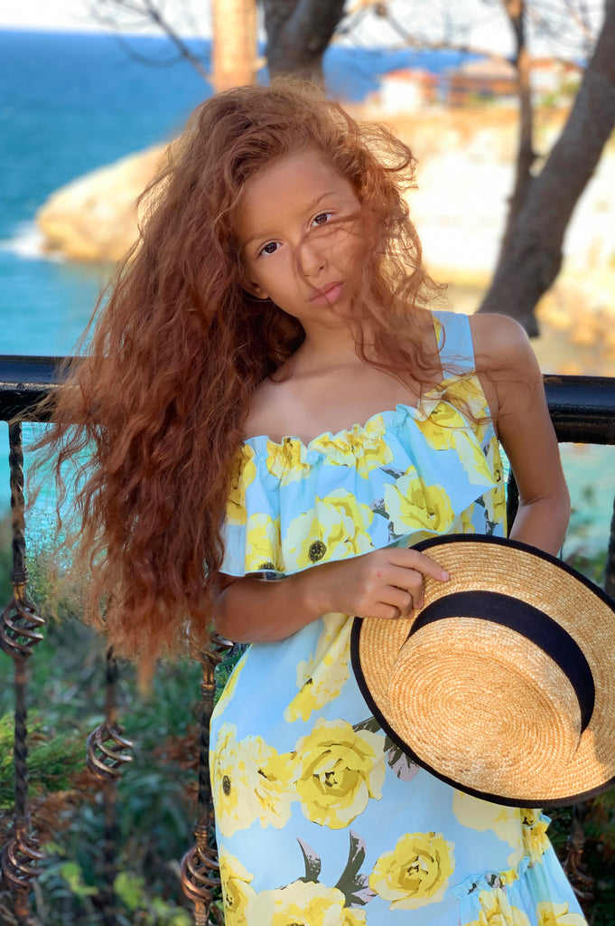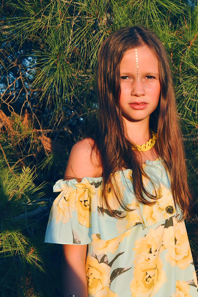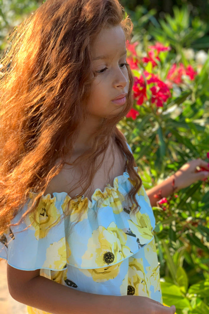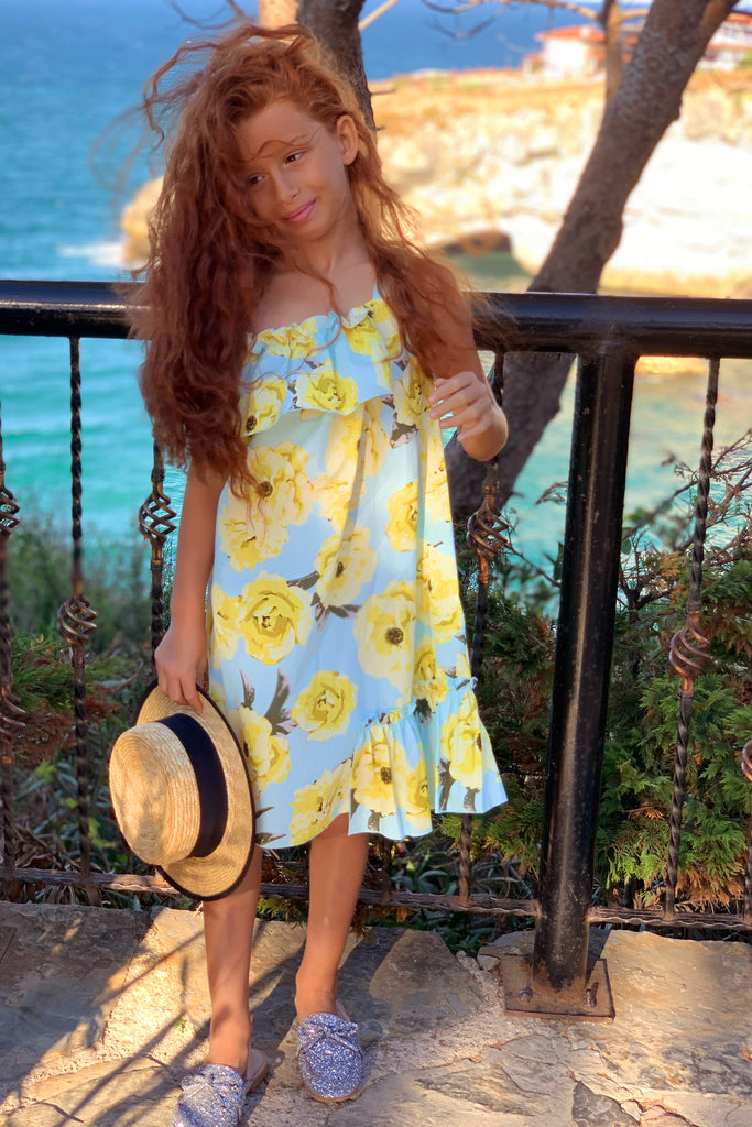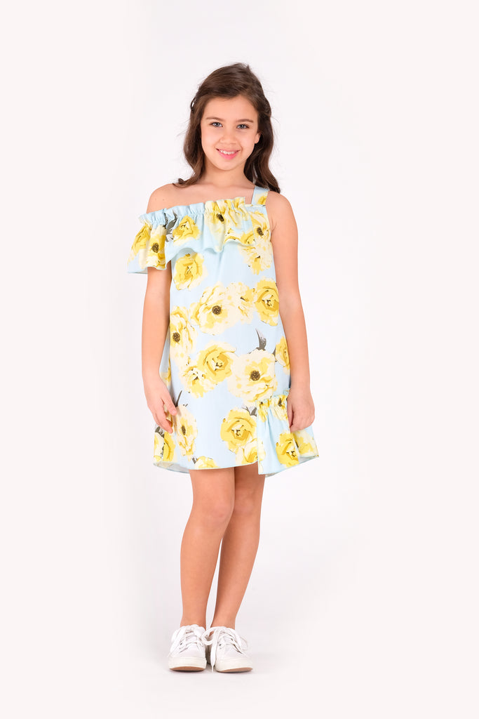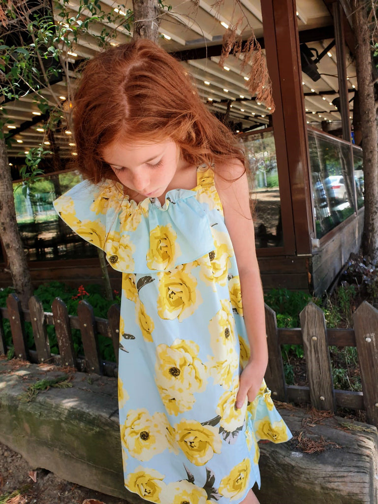 Tek omuz şıklığı ile hem rahat hem de sarı gül desenleri ile romantik, tamamı pamuktan bir SheShe elbisesi.