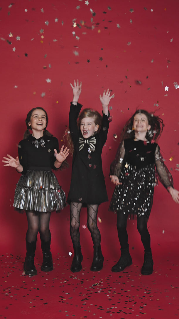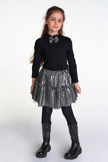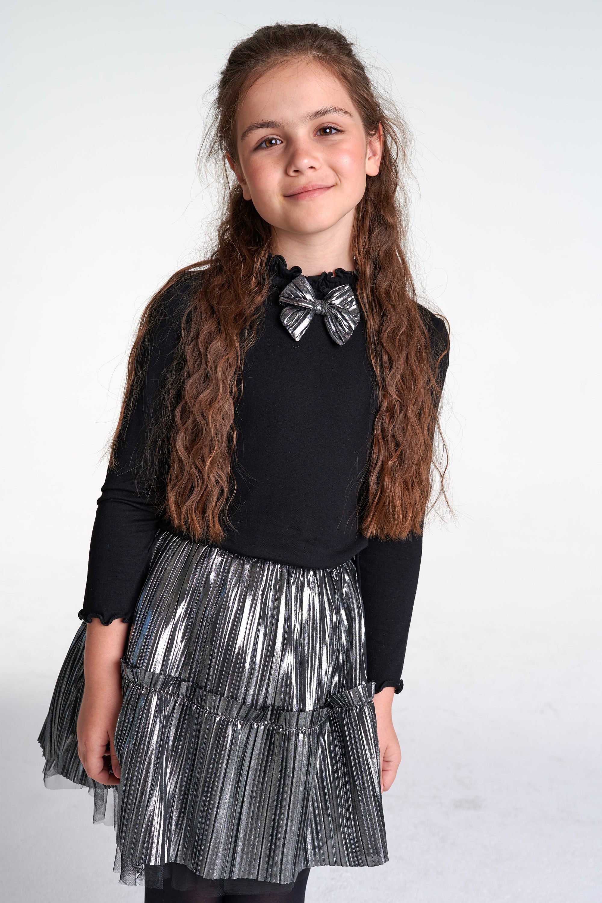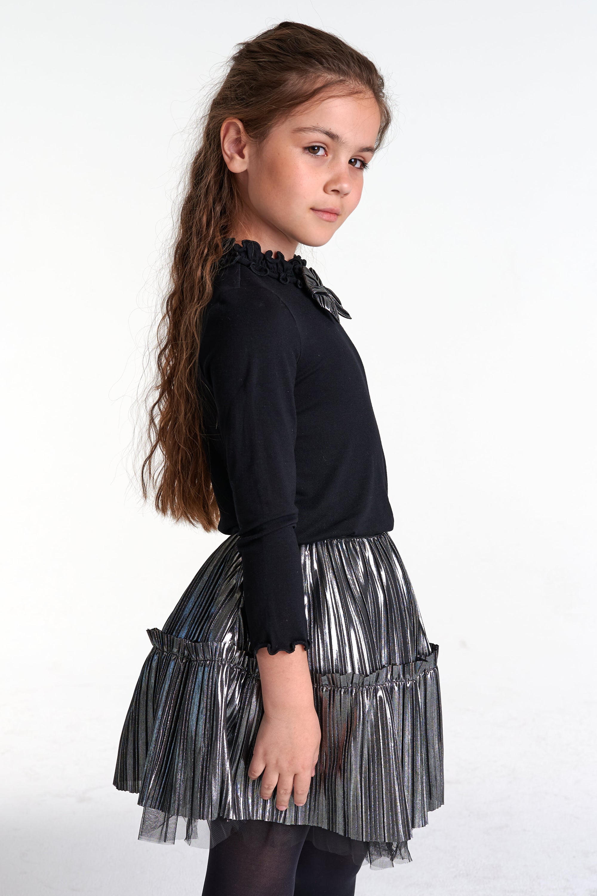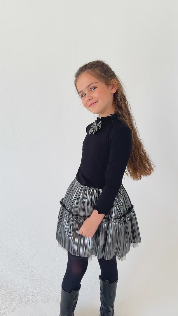 Sade ve şık kız çocuk blüz düz siyah kumaştan imal edilmiştir. Etek kısmı varaklı gümüş pileli kumaştandır ve etekleri fırfırlıdır. Eteğin altında tül astarı vardır ve bu da kabarık görüntü vermektedir.