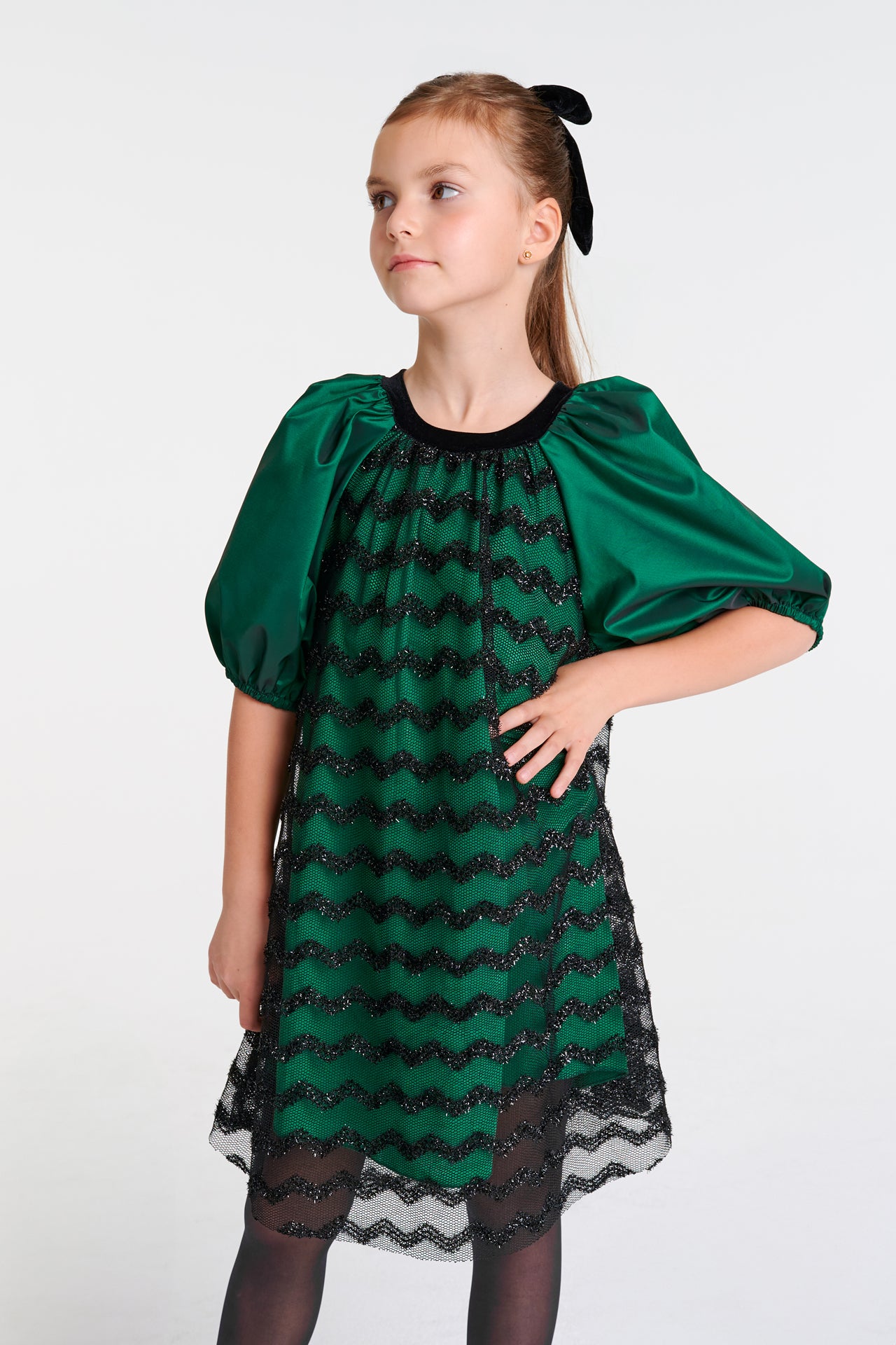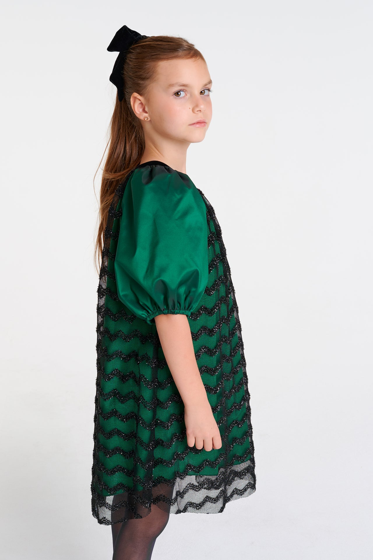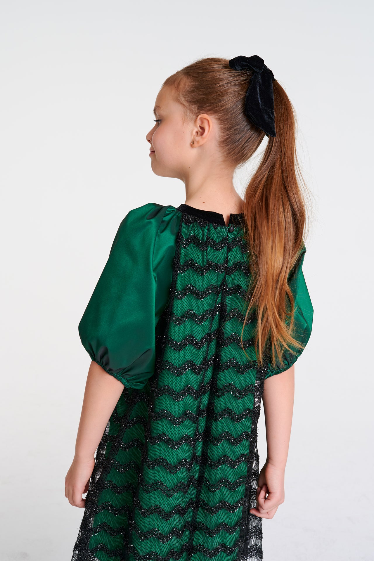 Yeşil tafta balon kollu kız çocuk elbise. Elbisenin ana bedeninde siyah dantel detayı vardır. Astarsızdır.