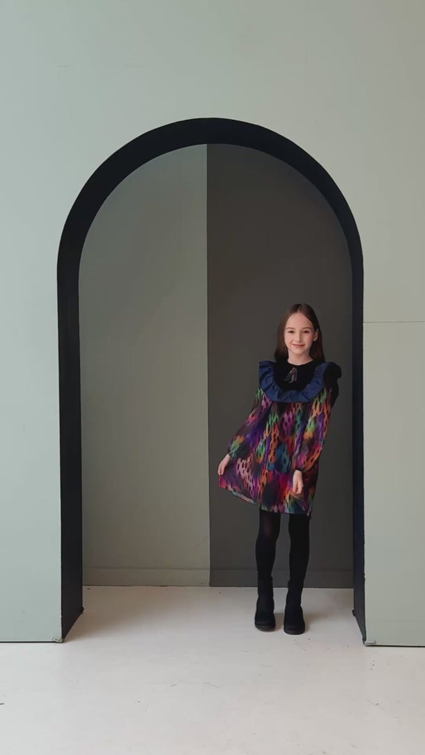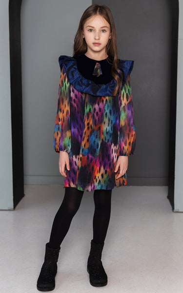 Yaka kısmı kadife ve tafta fırfırla tamamlanmıştır. Gövdesi yüksek kalite şifondur ve %100 pamuk astar sayesinde iç göstermez ve polyester ile temas olmaz.