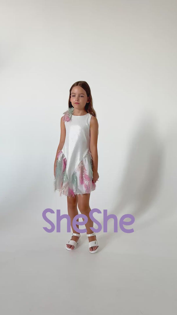 Gövdesi beyaz kumaş üzerine hafif gümüş renkli ışıltılarla süslenmiş bu abiye elbise, etek ucundaki pembe püsküllü tüy efektleriyle göz alıcı bir tasarım sunuyor. Özel günlerde giyilebilecek bu elbise, şıklığı ve zarafeti bir araya getiriyor. Hem modern hem de etkileyici bir tarz arayanlar için ideal bir seçenek.