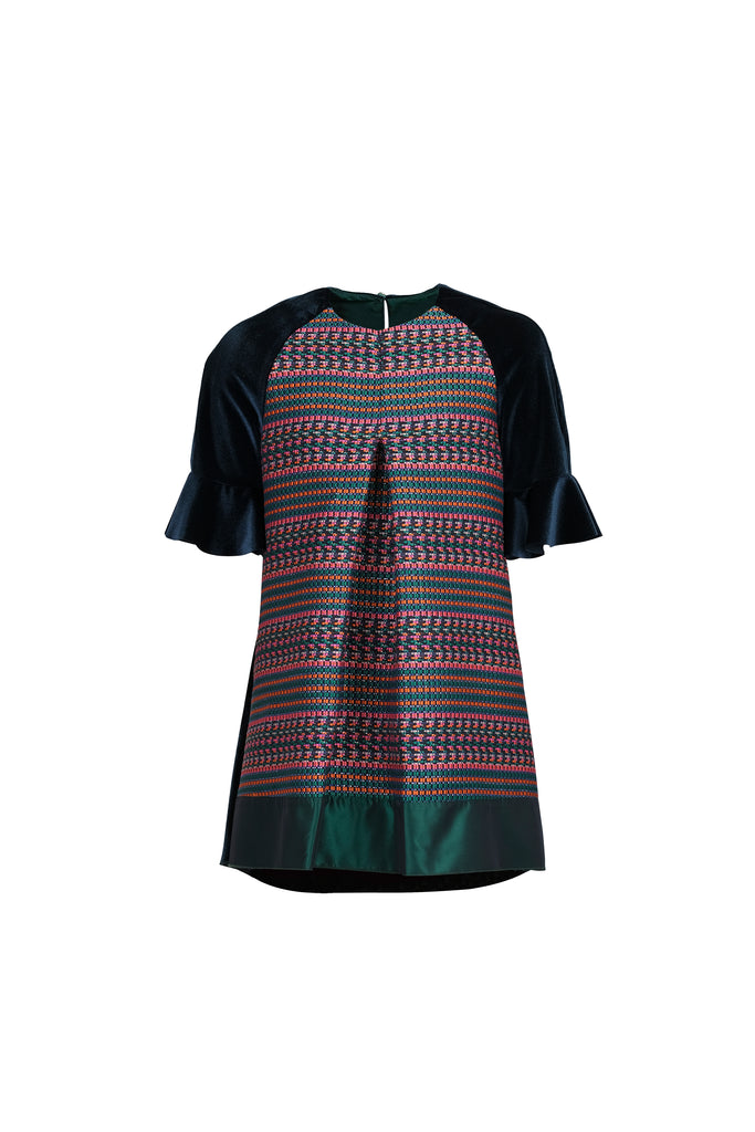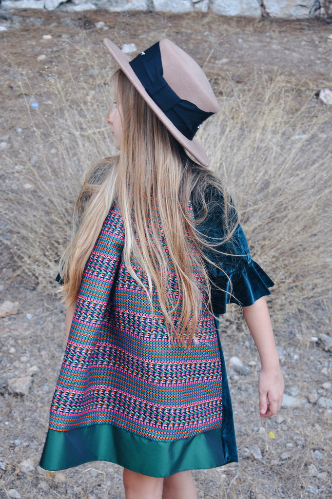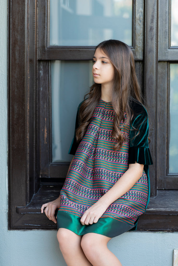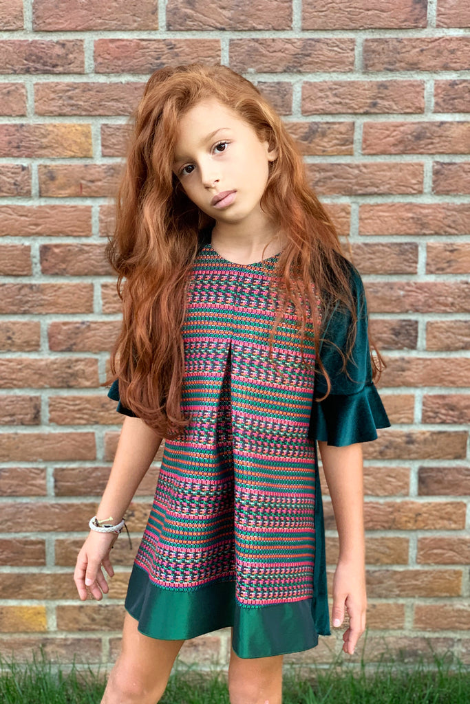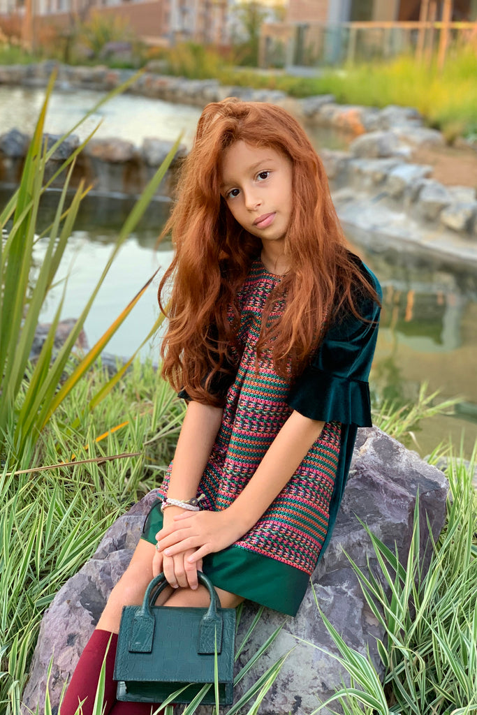 Sıcak yeşil kadifenin verdiği rahatlık ile renkli jakarın yarattığı şıklık SheShe yeşil kadife elbisede buluştu.