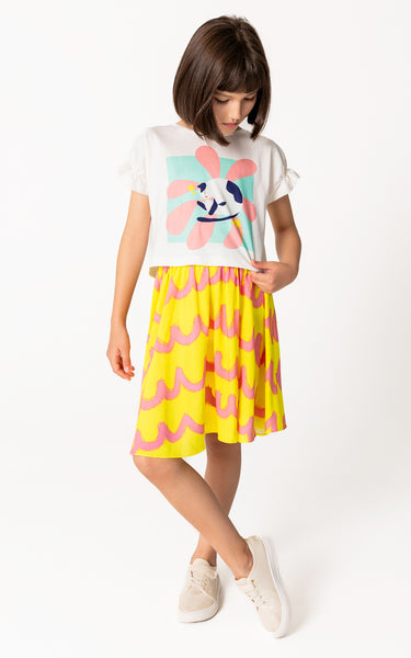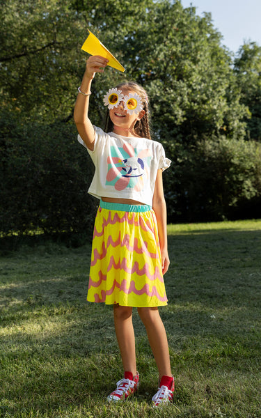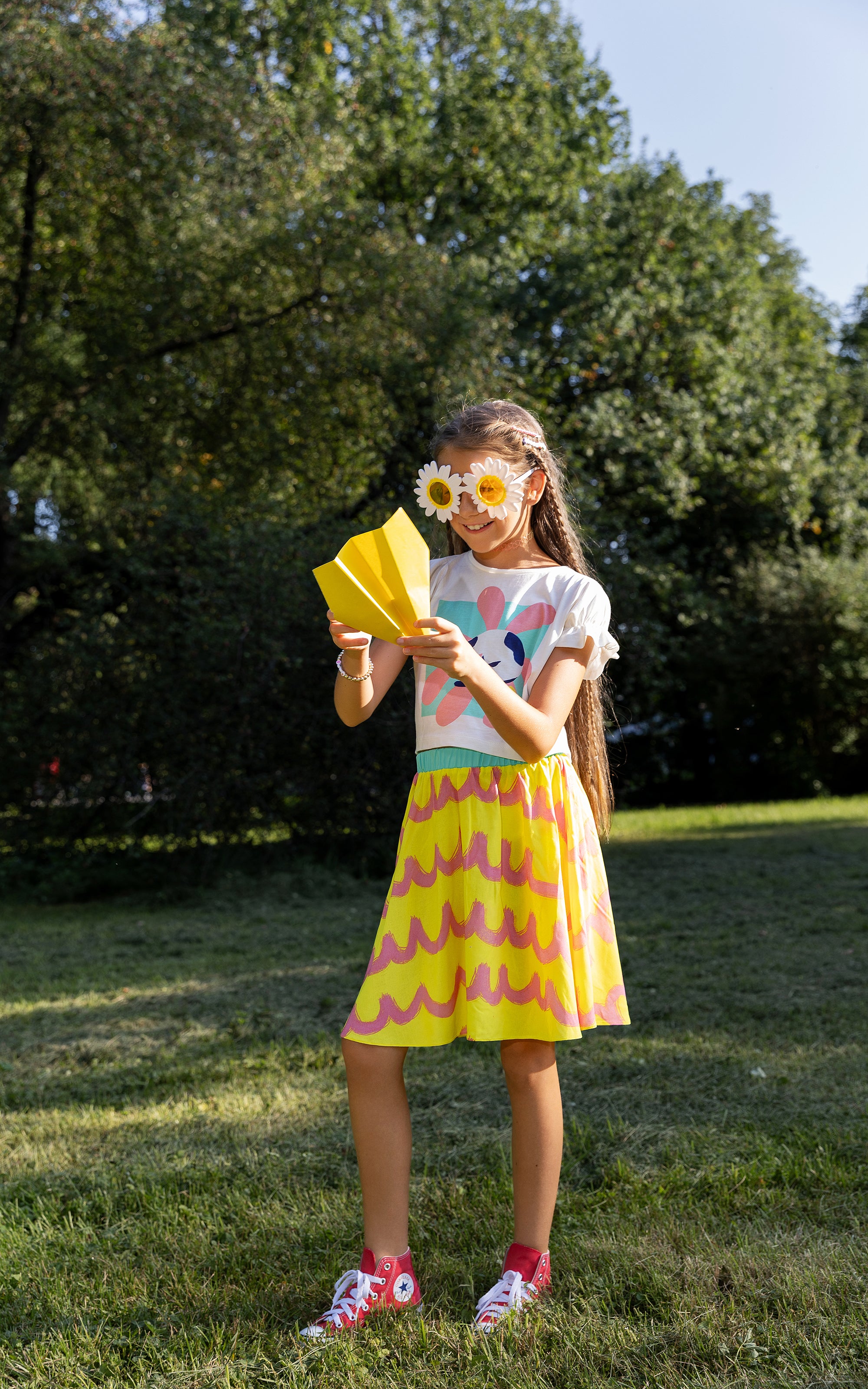 Zigzag desenleri ve sarı tonlarıyla dikkat çeken bu etek, eğlenceli ve samimi bir tarz sunuyor. Yazın enerjisini yansıtan bu etek, hem günlük kullanımda hem de arkadaş buluşmalarında rahatlıkla giyilebilecek bir parça.